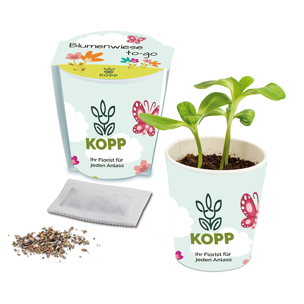 Unser frühlingshaft gestalteter Pflanzbecher ist ein nachhaltiges Giveaway mit besonderem Charme. Der wasserdichte Pappbecher ohne Kunststoff ist liebevoll bedruckt und enthält alles, was man für eine farbenfrohe Blumenwiese benötigt: eine Substrattablette als Erde sowie eine Sommerblumenmischung oder einen Samen nach Wahl. Die rundumlaufende Banderole im frischen Design bietet eine leicht verständliche Pflanzanleitung. Lassen Sie Ihre Werbebotschaft aufblühen – mit einer Blumenwiese, die Freude schenkt. Die Varianten: • Standardausführung: Ab Lager lieferbar, optional mit zusätzlichem Logoeindruck. • Individuelle Gestaltung: Ab 2.500 Stück mit personalisierten Außenseiten für ein einzigartiges Design.