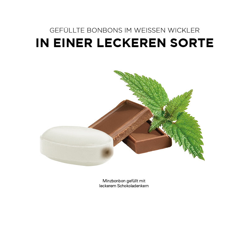 Ovales Minzbonbon gefüllt mit leckerem Schokoladenkern im Wickler aus kompostierbarer weißer Folie, gefüllt, individuell bedruckt. Inhalt: Schoko-Minz Bonbon, oval, gefüllt mit leckerem Schokoladenkern, einzeln eingewickelt, Mindestmenge 50 kg (ca. 9.200 Bonbons)