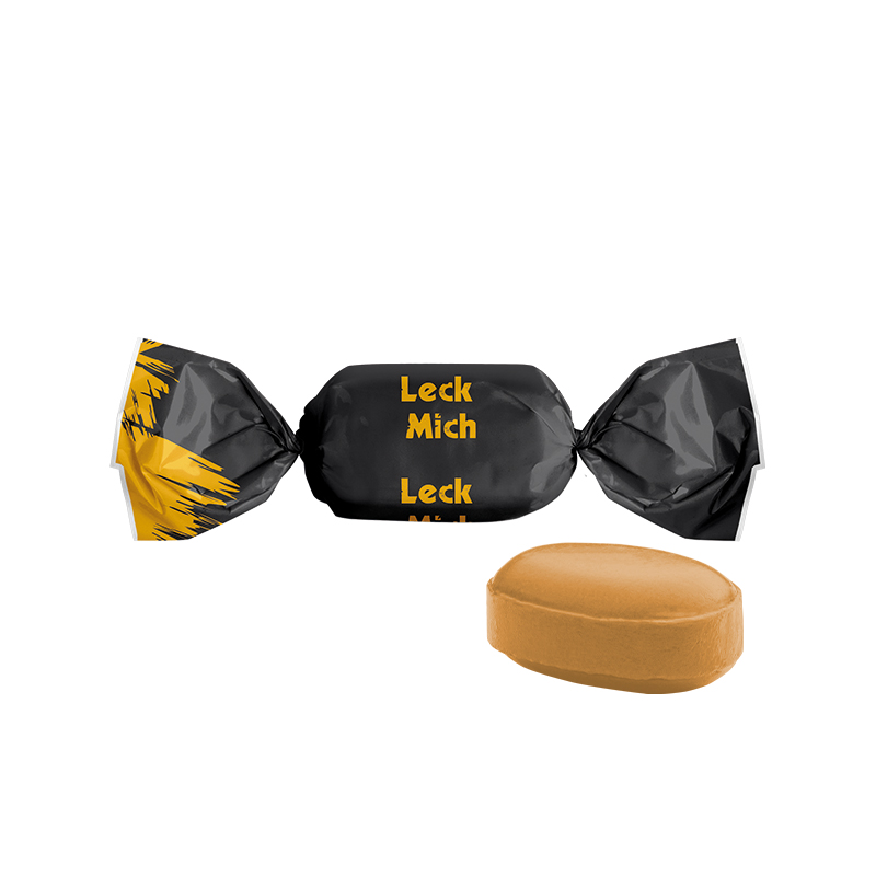 Ovales Karamell Bonbon im Wickler aus kompostierbarer weißer Folie, ungefüllt, individuell bedruckt. Inhalt: Karamell Bonbons, oval, einzeln eingewickelt, 5 g. Mindestmenge 50 kg (ca. 10.500 Bonbons)
