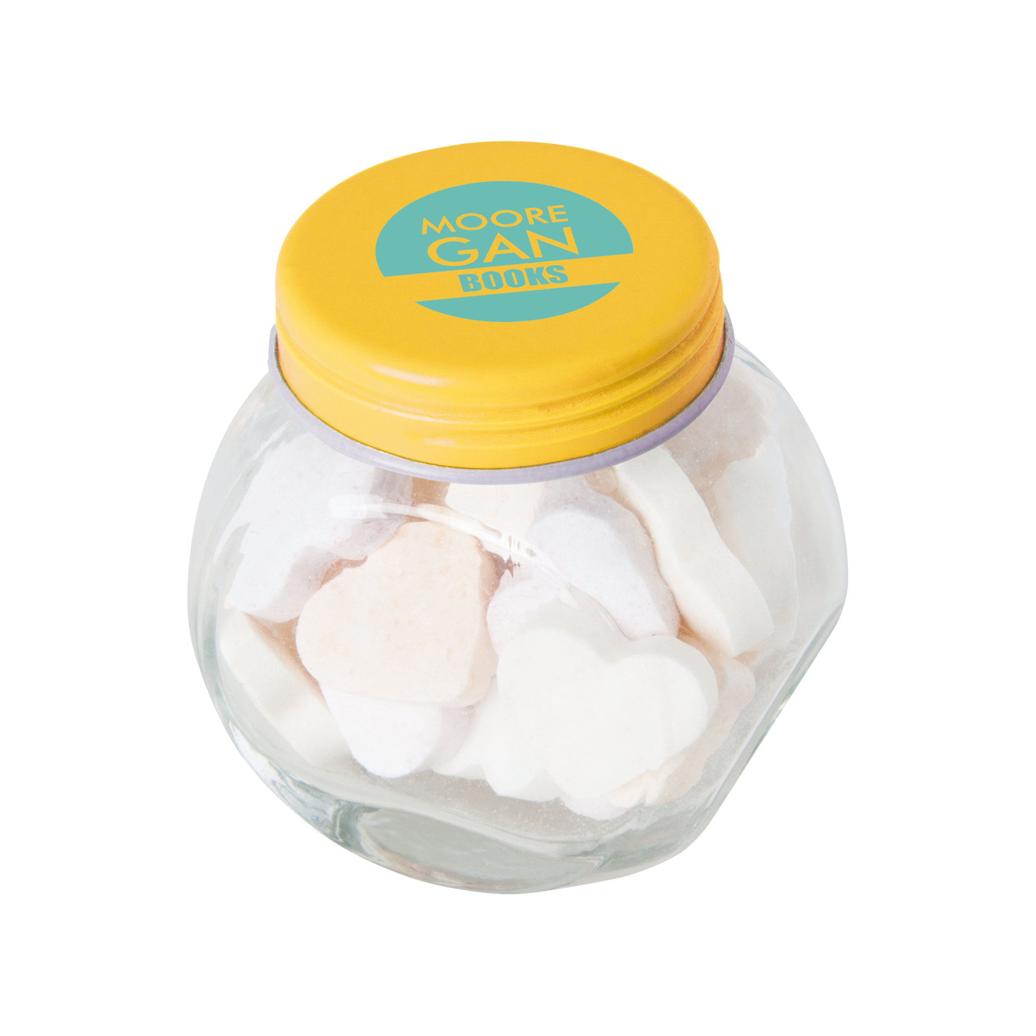 Bonbonglas mini gefüllt mit ca. 40 gr. Fruchtherzchen mit farbigem Deckel, 53 x 35 x 55 mm, Bedruckung auf Deckel.
