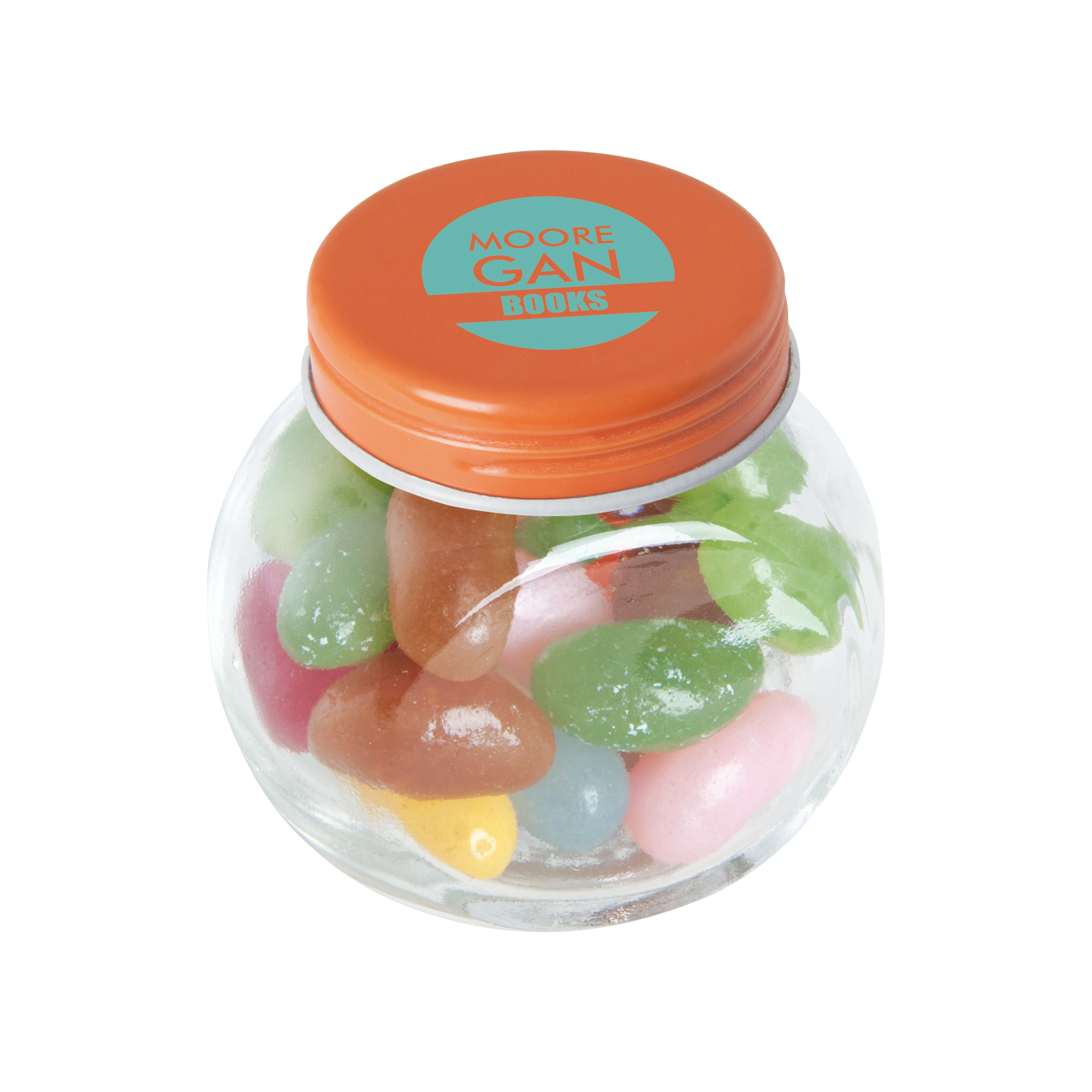 Bonbonglas mini gefüllt mit ca. 40 gr. Jelly Beans mit farbigem Deckel, 53 x 35 x 55 mm, Bedruckung auf Deckel.