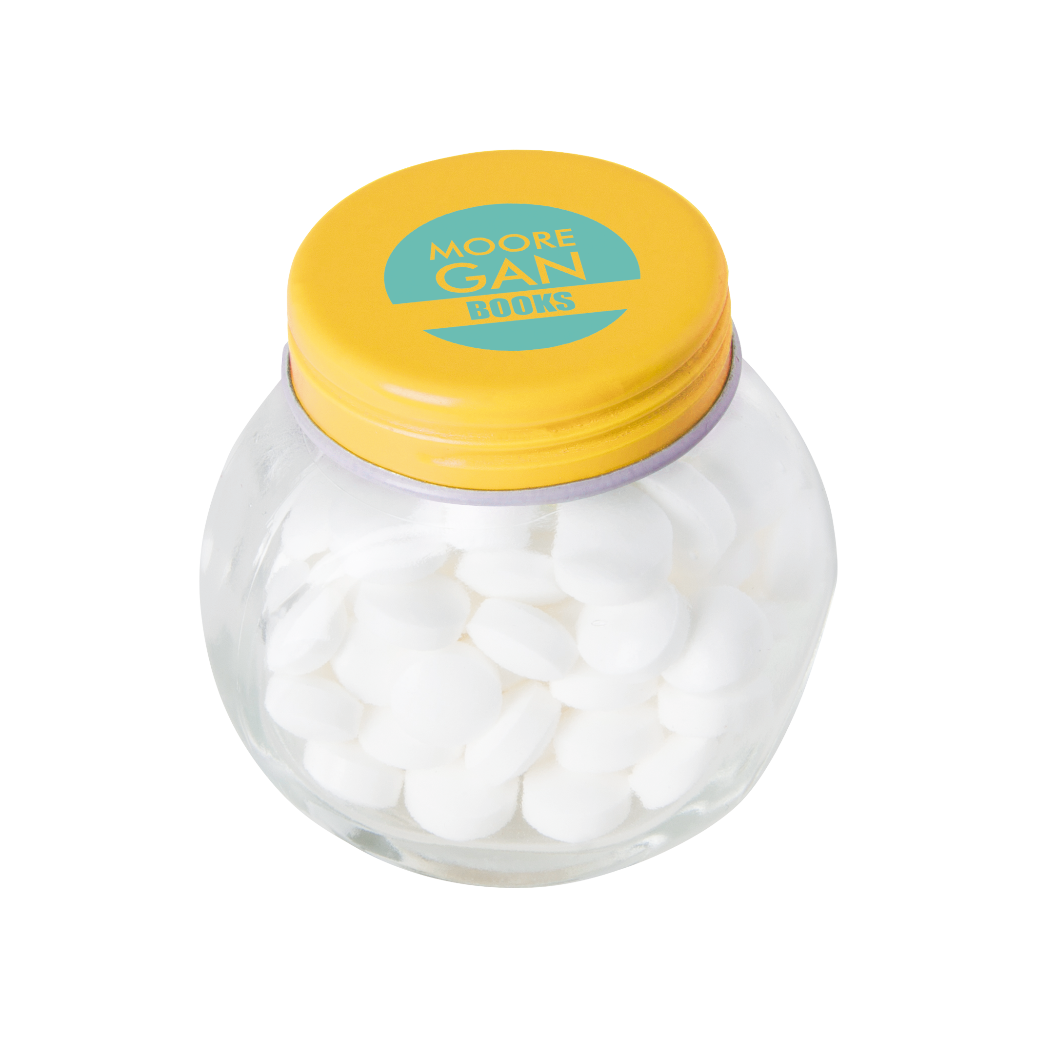 Bonbonglas mini gefüllt mit ca. 40 gr. Mints mit farbigem Deckel, 53 x 35 x 55 mm, Bedruckung auf Deckel, mit verschiedenen Füllungen: Schokoperlen gold, knuspriger Schokoladen festival, knusprige schokoladen Juwelen, goldglitzer Milchschokolade, kleine Herzen gold, kleine Herzen rot / weiß, marmorgold Schoko dunkel, mikro Milchschokoladeneier, mini Schokoperlen gold, mini Schokoperlen kupfer, roseglitzer Milchschokolade, silberglitzer Milchschokolade und sommerkonfetti Schoko dunkel.