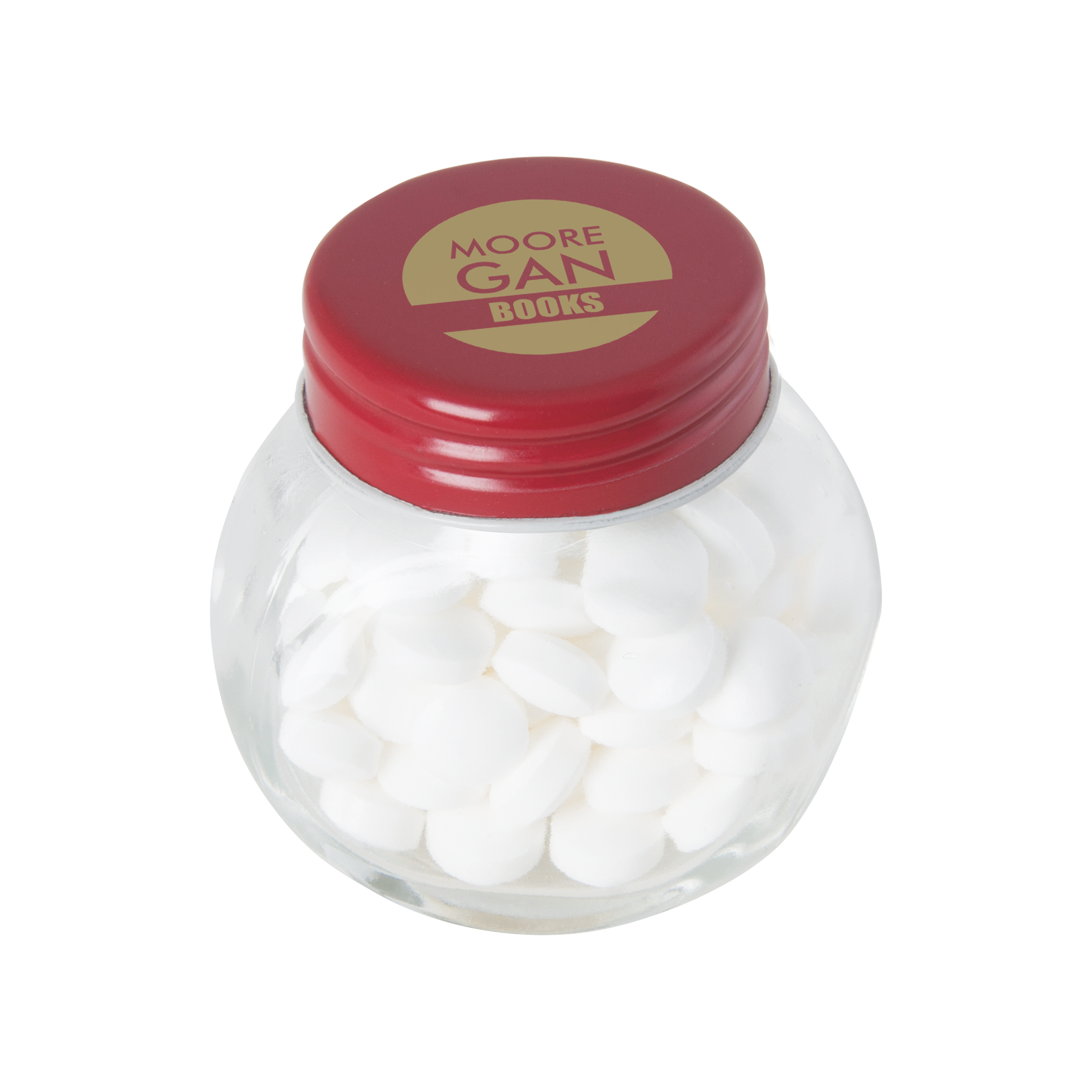 Bonbonglas mini gefüllt mit ca. 40 gr. Mints mit farbigem Deckel, 53 x 35 x 55 mm, Bedruckung auf Deckel, mit verschiedenen Füllungen: Schokoperlen gold, knuspriger Schokoladen festival, knusprige schokoladen Juwelen, goldglitzer Milchschokolade, kleine Herzen gold, kleine Herzen rot / weiß, marmorgold Schoko dunkel, mikro Milchschokoladeneier, mini Schokoperlen gold, mini Schokoperlen kupfer, roseglitzer Milchschokolade, silberglitzer Milchschokolade und sommerkonfetti Schoko dunkel.