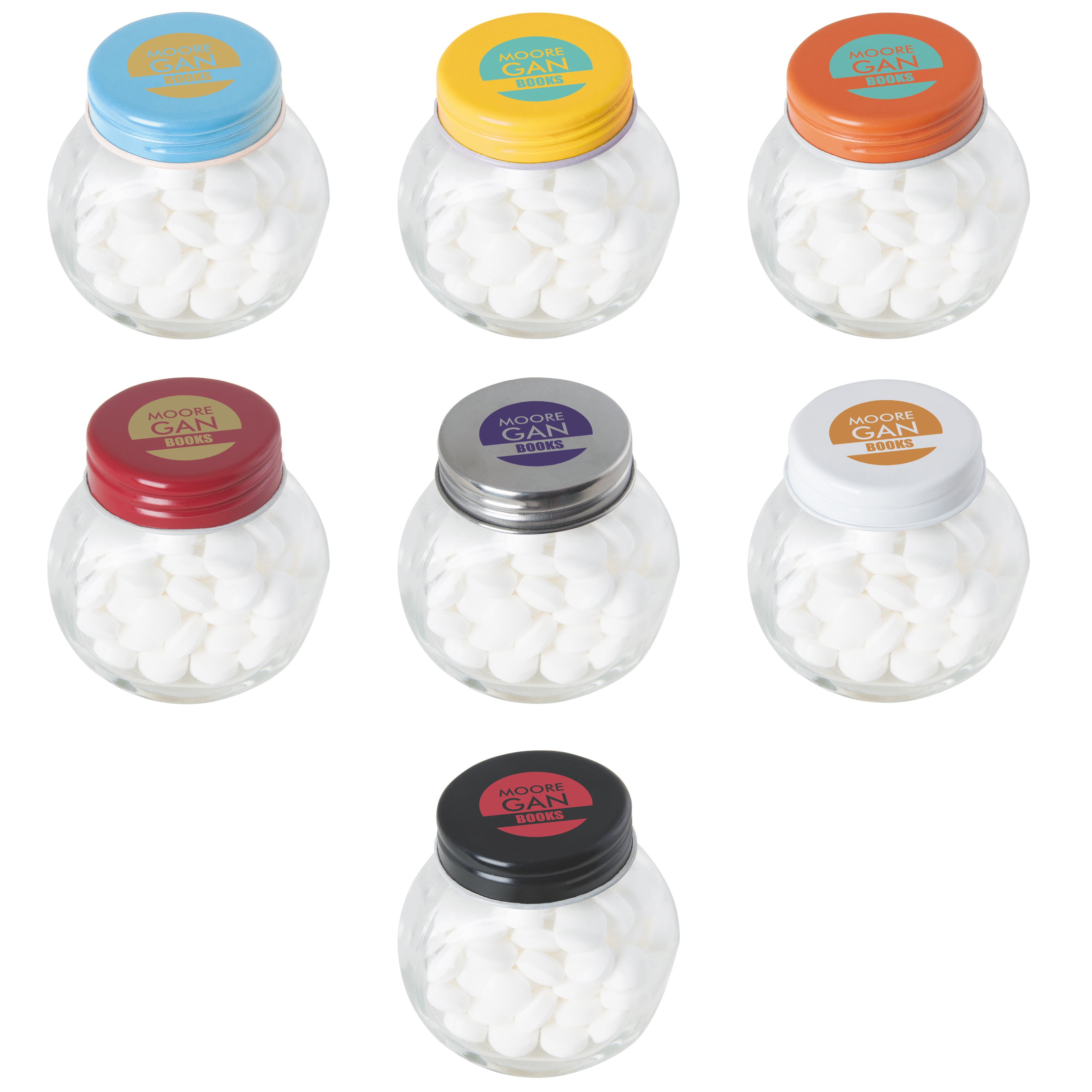 Informationen zu "Bonbonglas mini gefüllt mit ca. 40 gr. Mints mit farbigem Deckel"