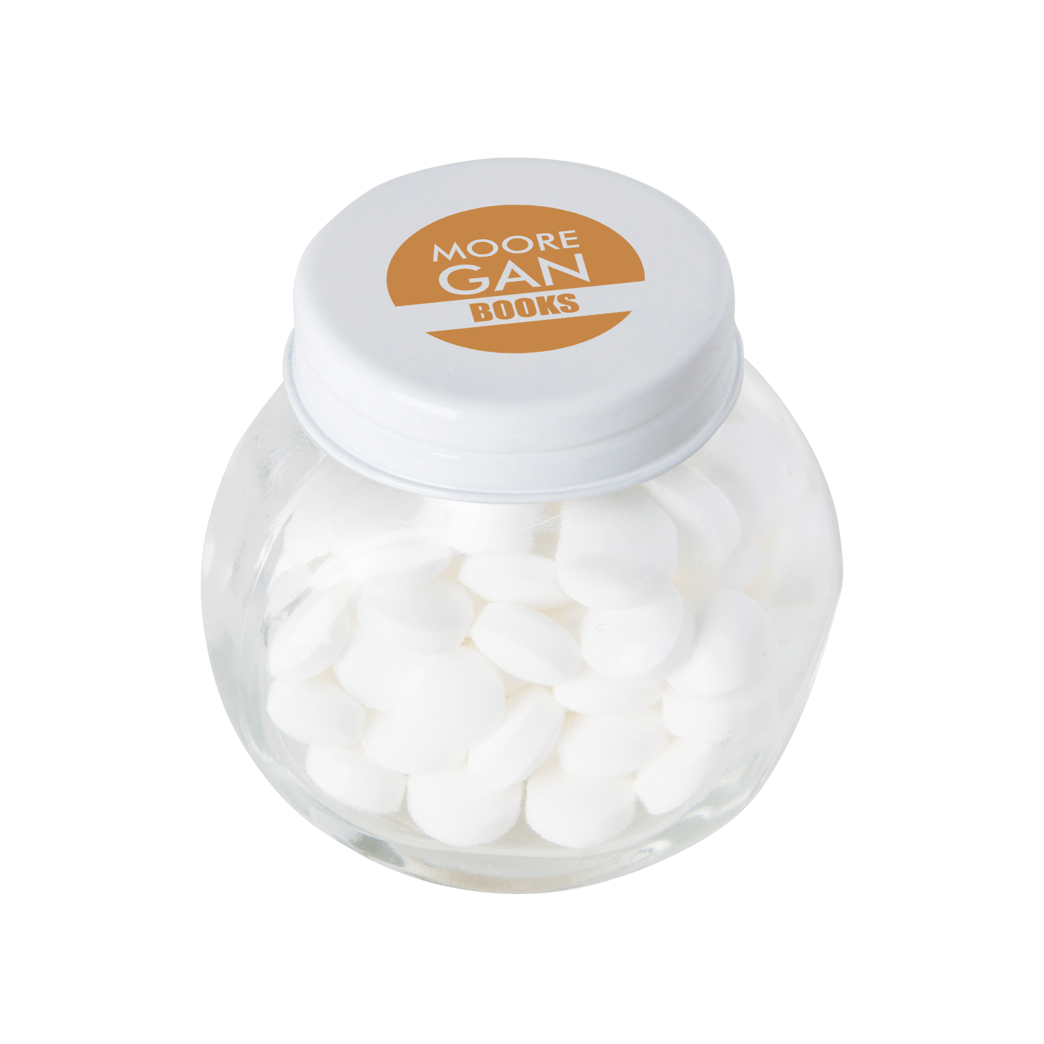 Bonbonglas mini gefüllt mit ca. 40 gr. Mints mit farbigem Deckel, 53 x 35 x 55 mm, Bedruckung auf Deckel, mit verschiedenen Füllungen: Schokoperlen gold, knuspriger Schokoladen festival, knusprige schokoladen Juwelen, goldglitzer Milchschokolade, kleine Herzen gold, kleine Herzen rot / weiß, marmorgold Schoko dunkel, mikro Milchschokoladeneier, mini Schokoperlen gold, mini Schokoperlen kupfer, roseglitzer Milchschokolade, silberglitzer Milchschokolade und sommerkonfetti Schoko dunkel.