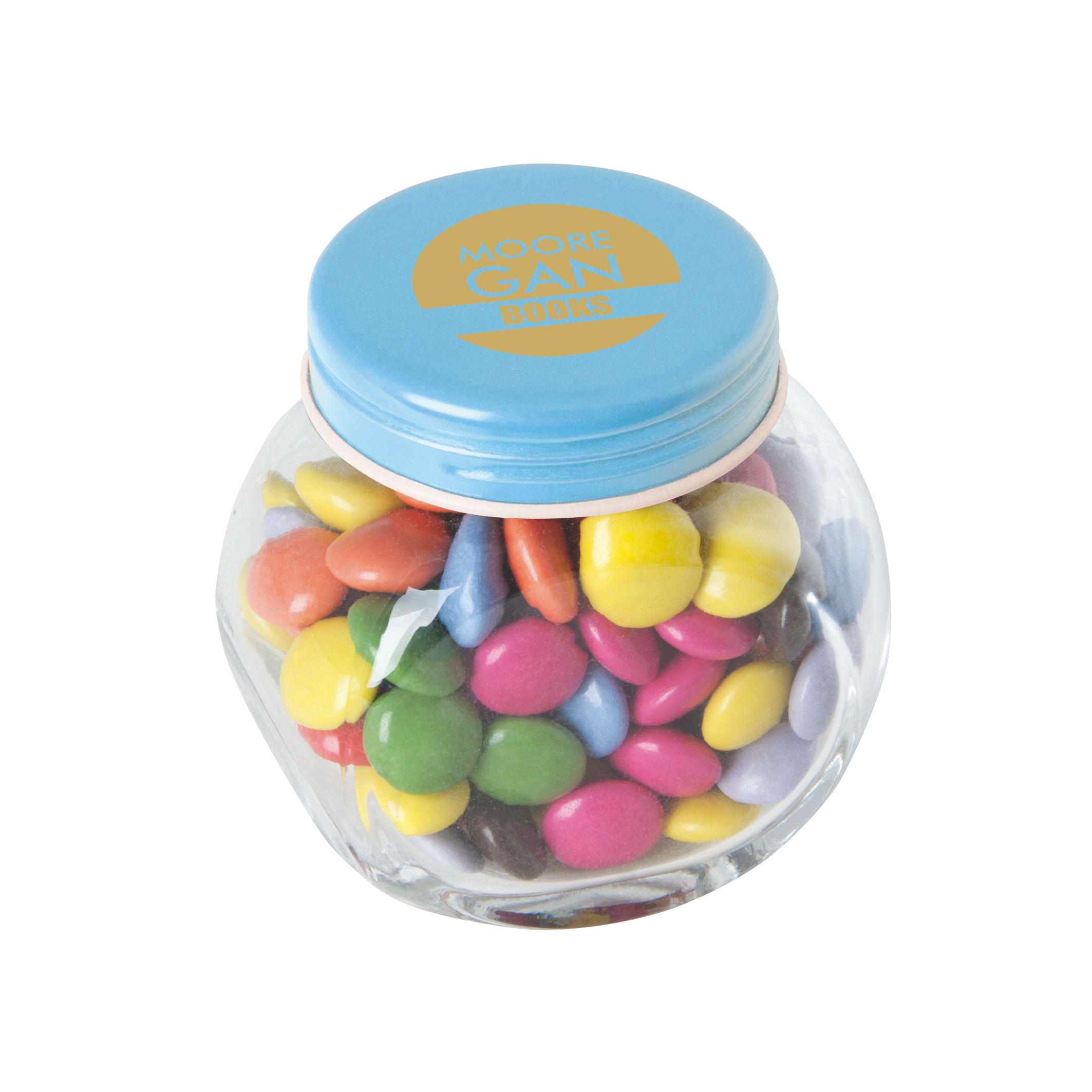 Bonbonglas mini gefüllt mit ca. 40 gr. Schokocarletties mit farbigem Deckel, 53 x 35 x 55 mm, Bedruckung auf Deckel.