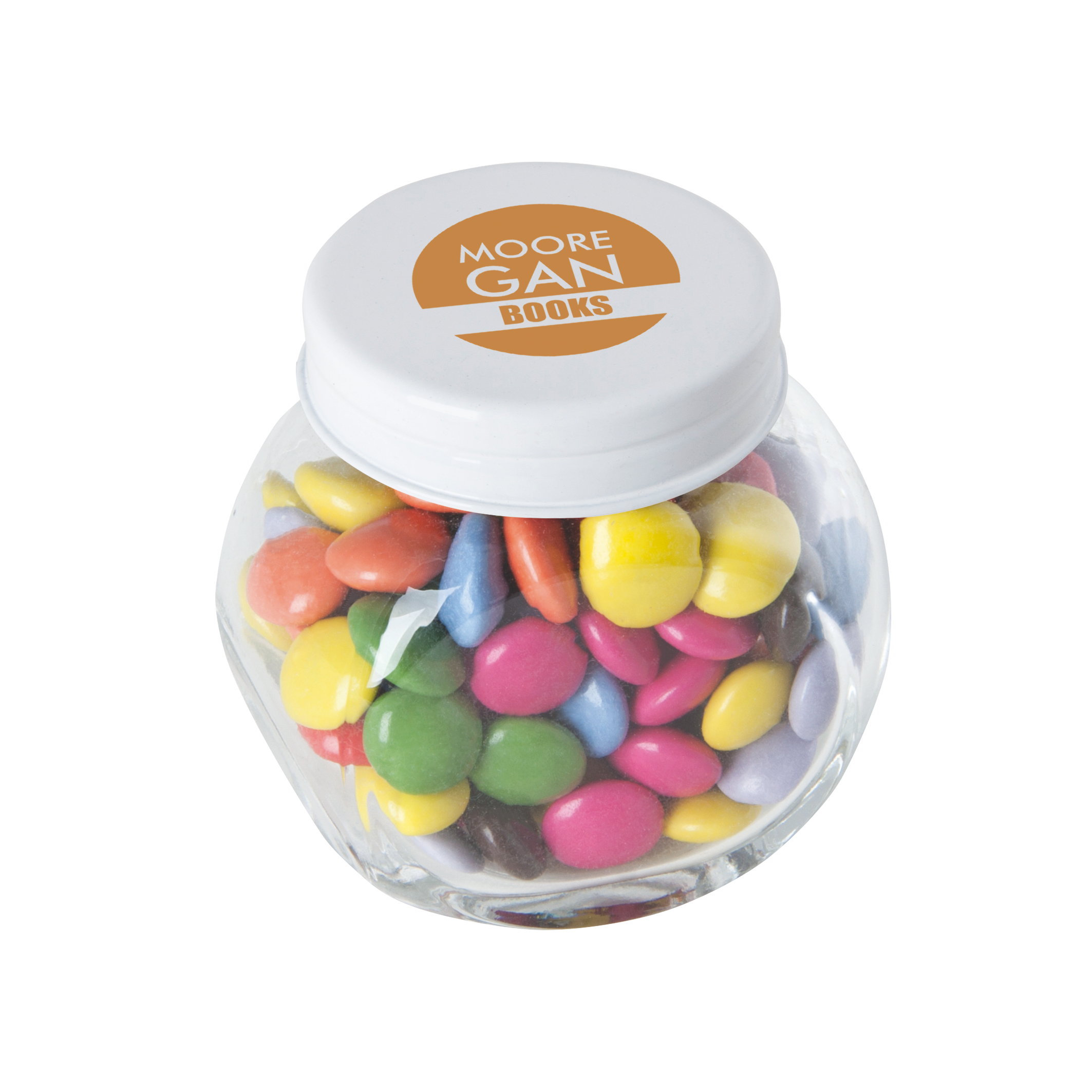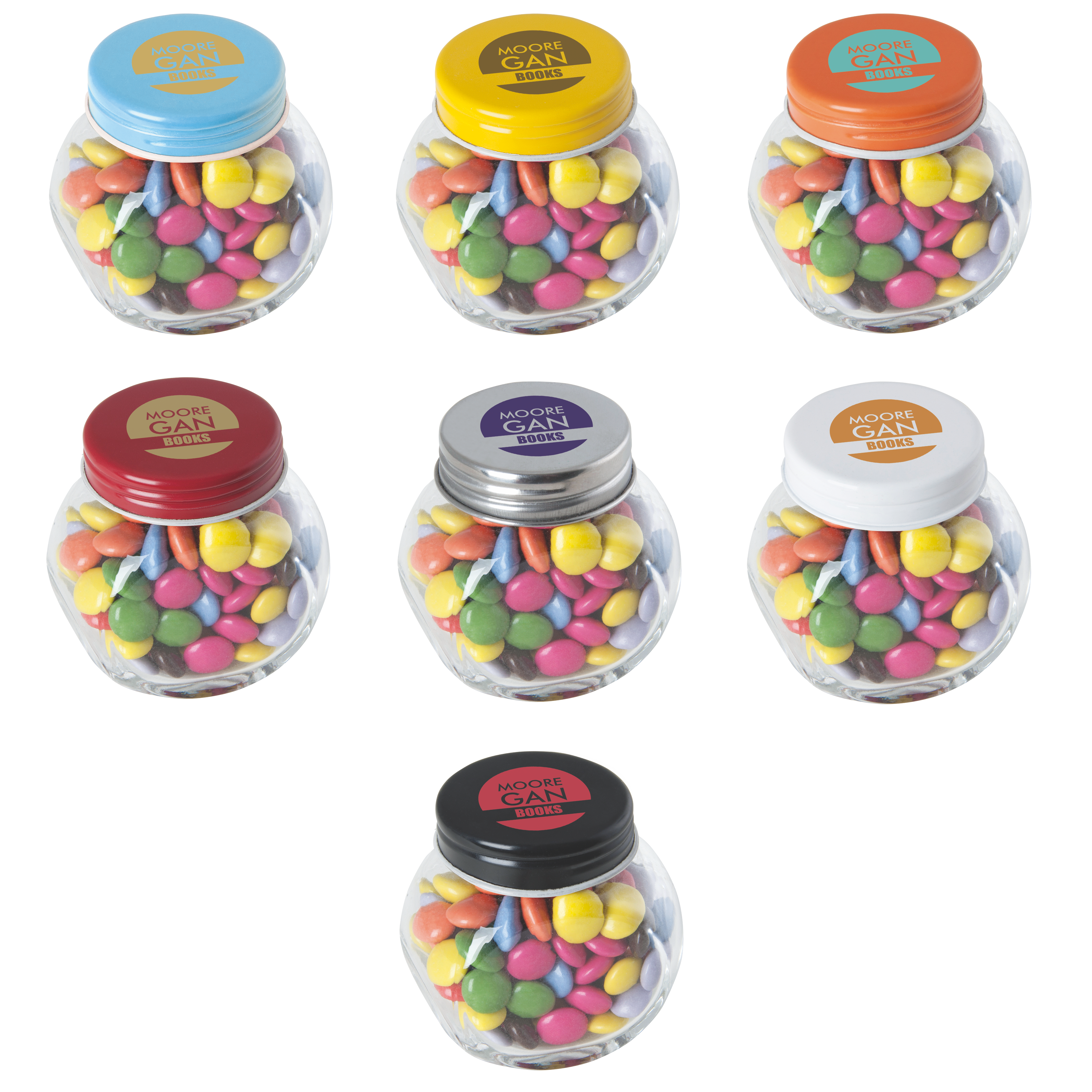 Bonbonglas mini gefüllt mit ca. 40 gr. Schokocarletties mit farbigem Deckel, 53 x 35 x 55 mm, Bedruckung auf Deckel.