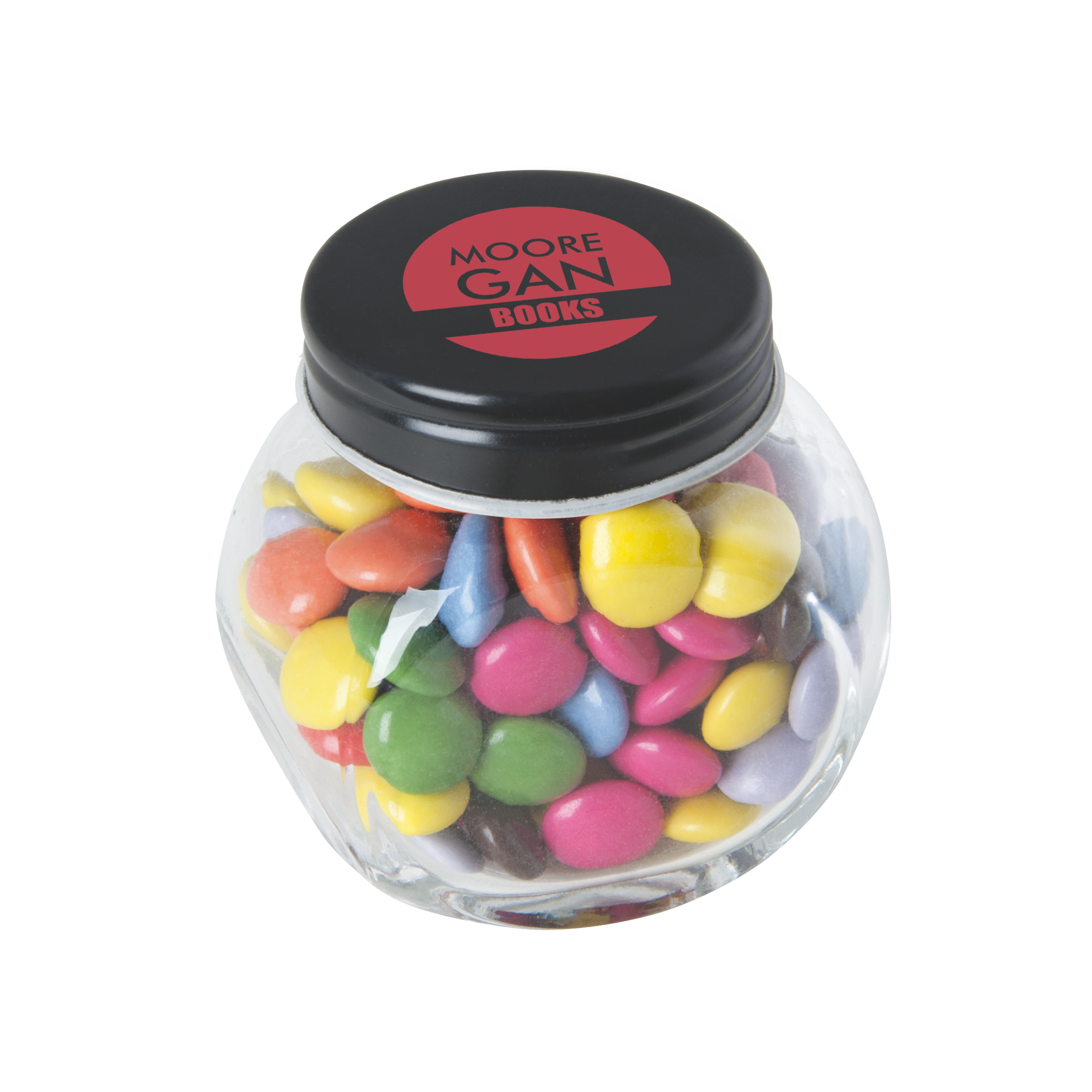 Bonbonglas mini gefüllt mit ca. 40 gr. Schokocarletties mit farbigem Deckel, 53 x 35 x 55 mm, Bedruckung auf Deckel.
