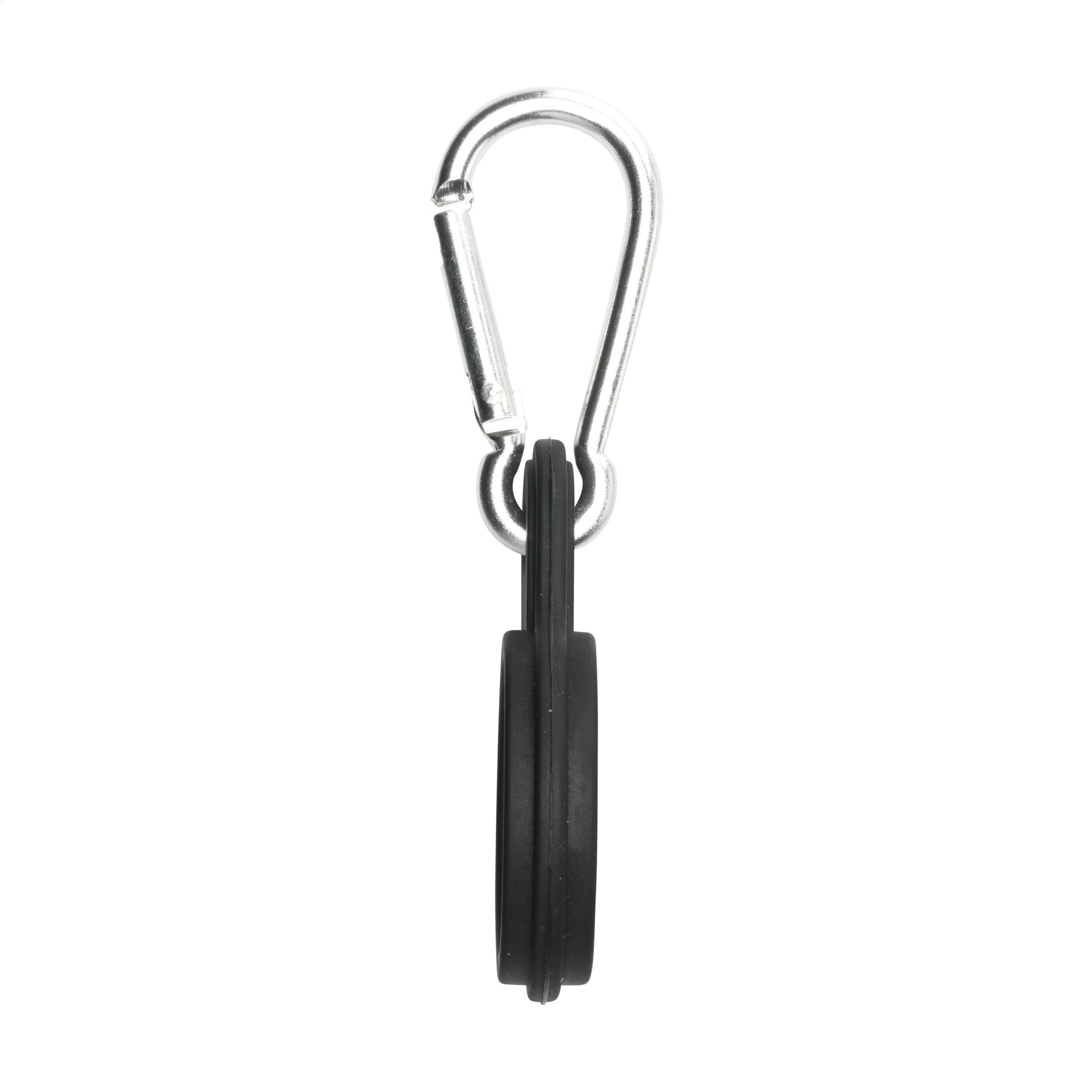 Silikonschlaufe mit Karabinerhaken. Bringen Sie die flexible Schlaufe an Ihrer Wasserflasche an und befestigen Sie sie mithilfe des Karabiners an einem Rucksack oder einer Sporttasche.