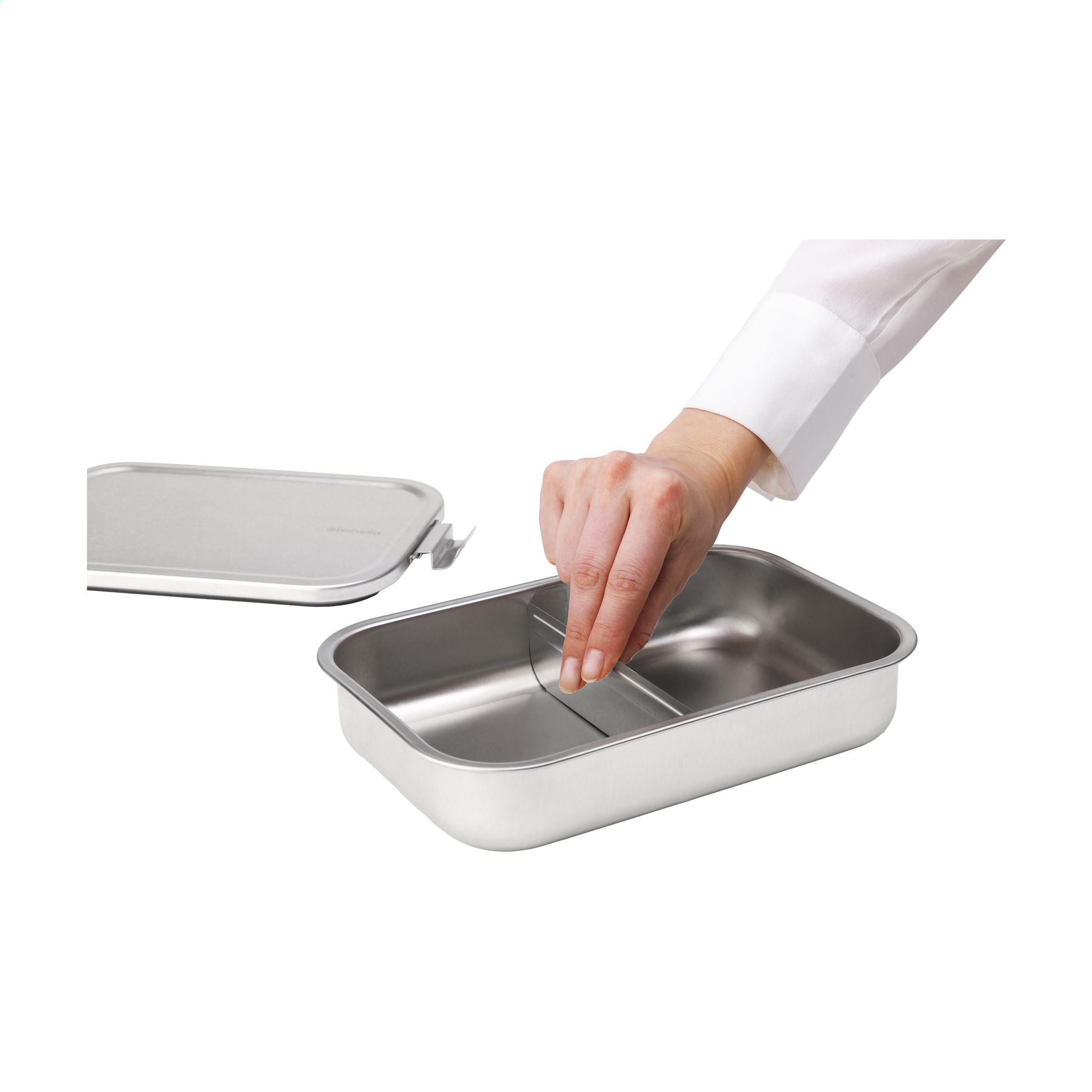 Lunchbox der Marke Brabantia aus hochwertigem Edelstahl mit herausnehmbarer Trennwand. So bleiben Ihre Brote, Wraps und Brötchen schön getrennt. Die wiederverwendbare Lunchbox hat einen sicheren Klickverschluss und einen luftdichten Verschluss, damit dein Mittagessen länger frisch bleibt. Backofenfest (ohne Deckel), gefrierfest und spülmaschinenfest. Hergestellt aus 55% recyceltem Material. 100% recycelbar. Mit 5 Jahren Herstellergarantie. Fassungsvermögen 2.000 ml. Brabantia ist B-Corp-zertifiziert; die Kollektion wird nach den höchstmöglichen ökologischen und sozialen B-Corp-Standards hergestellt.
