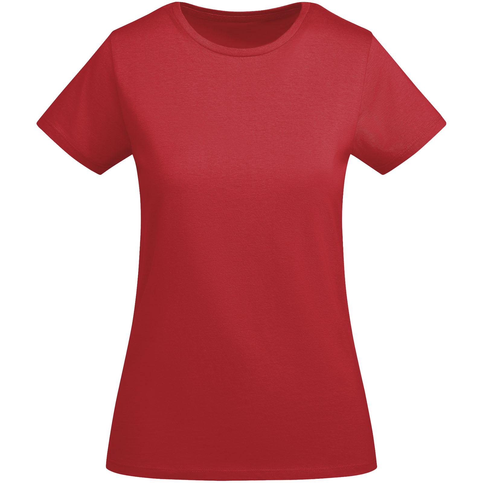 Tailliertes kurzärmeliges T-Shirt aus Bio-Baumwolle für Damen. Rundhalsausschnitt mit 1×1 Rippstrick. Verstärkte und verdeckte Nähte am Kragen. Herausnehmbares Etikett.