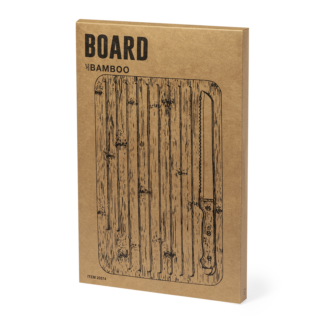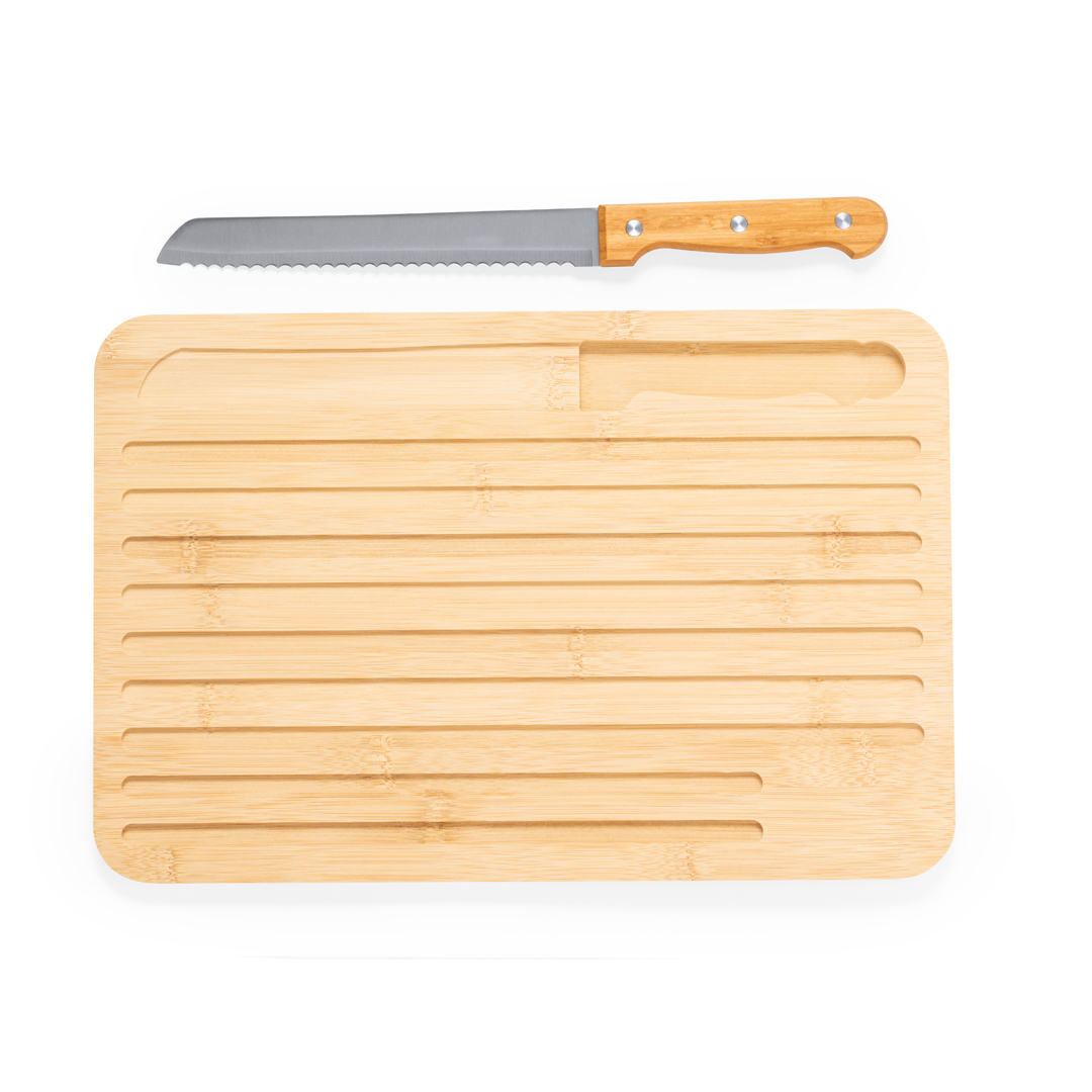 Küchenbrett aus Bambus, inklusive Messer. Mit einer glatten Seite, die für verschiedene Zwecke geeignet ist, und einer gestanzten Seite, ideal zum Schneiden von Brot oder saftigen Lebensmitteln. Inklusive Fach mit Messer darin (Sägestahlklinge und Bambusgriff). Materialien wie Bambus fördern die Verwendung natürlicher Rohstoffe und reduzieren so den Schadstoffausstoß. Darüber hinaus stammt Bambus aus einer äußerst widerstandsfähigen und vielseitigen Pflanze mit schnellem Wachstum und Regeneration, was ihn zu einer hervorragenden Alternative zu herkömmlichem Holz macht.