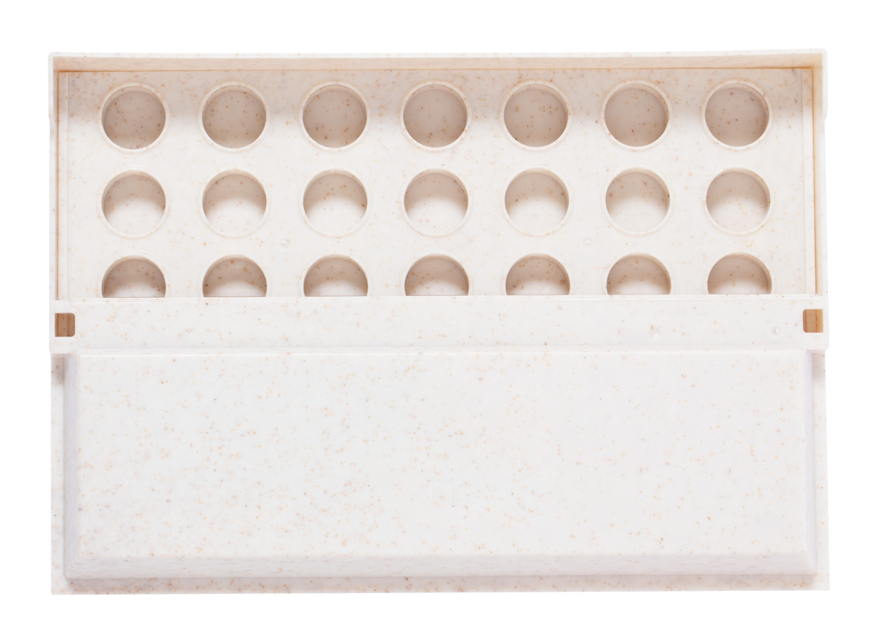 Brettspiel aus ökologischem Weizenstrohkunststoff mit faltbarem vertikalen Brett und 42 Spielsteinen. Während des Spiels werfen die Spieler abwechselnd Spielsteine auf das Brett und versuchen, vier Spielsteine in einer Reihe anzuordnen.