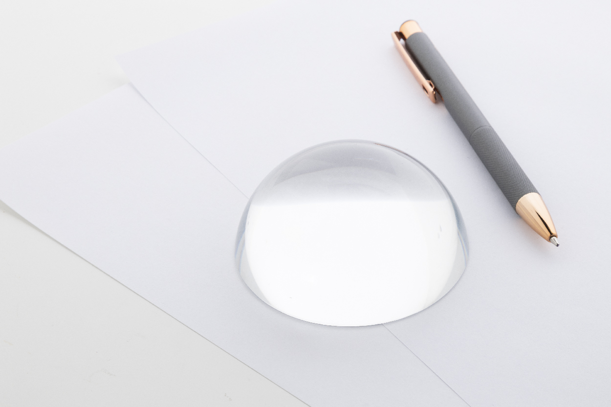 Briefbeschwerer und Lupe aus Glas in Form einer Kuppel. In schwarzer Geschenkbox aus Papier mit Samteinlage und Magnetverschluss.