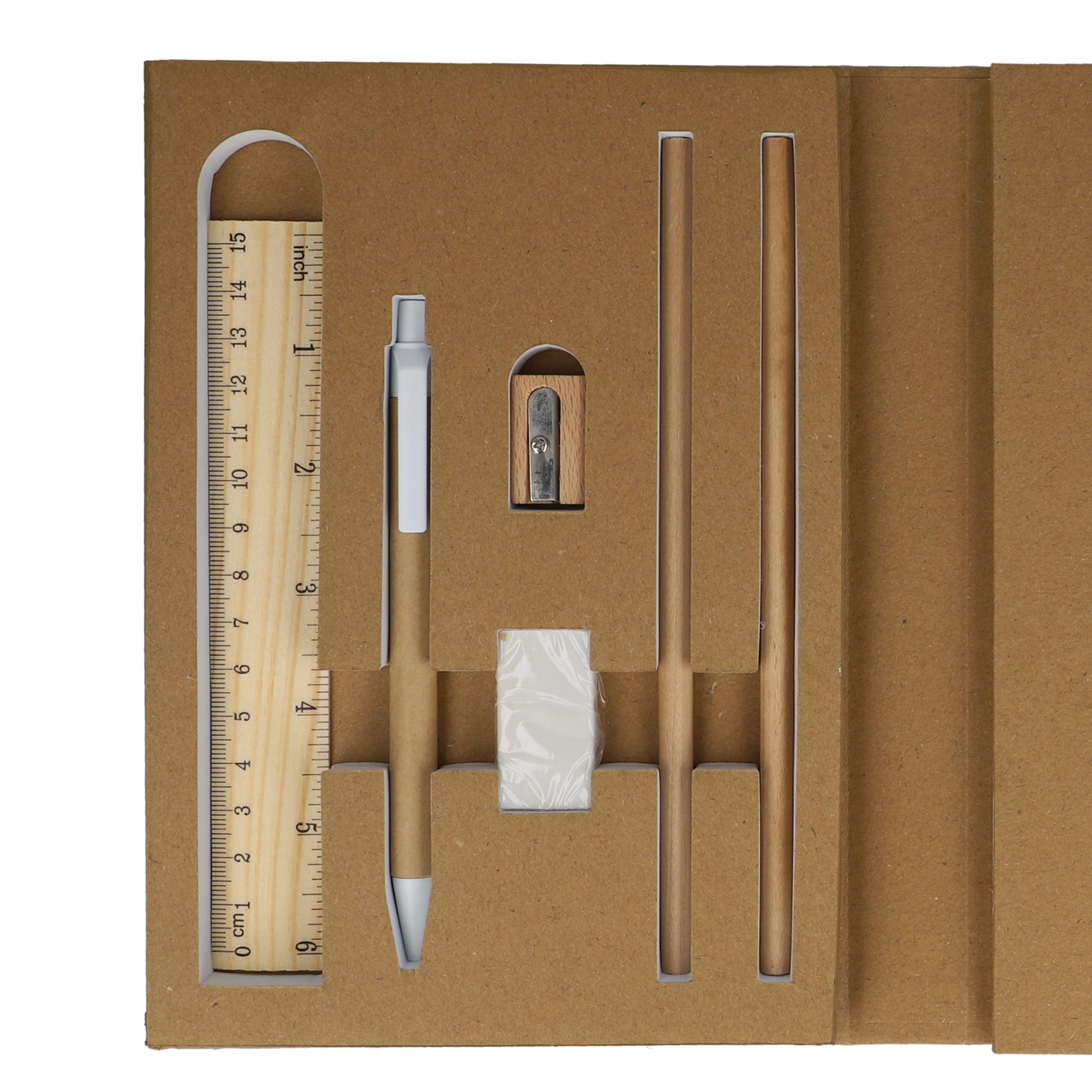 Dieses nachhaltige, dreifach gefaltete Schreibset besteht aus einem Umschlag aus 120 g / m² Recyclingpapier. Es enthält einen Notizblock mit 40 Blatt cremefarbenem Papier, 25 Blatt Memoblock, Indexstreifen in fünf Farben (je 25 Blatt), Bleistift aus Espenholz, Lineal aus Kiefernholz, Anspitzer aus Buchenholz, Tasche für Namenskarten und einen Papierstift.