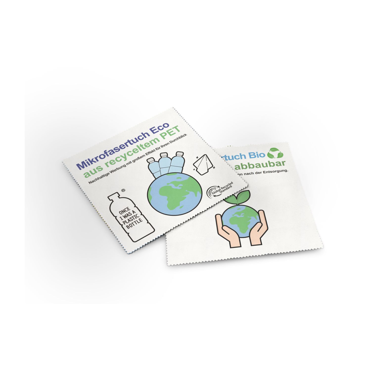 Diese Mikrofastertücher aus recyceltem PET*, hergestellt aus alten Wasserflaschen, sind ideal zur kratzfreien Reinigung aller glatten Oberflächen, wie Ihren Bildschirm, das Handydisplay oder Ihre Brille. Ein lebendiger Digitaldruck macht dieses leichte und praktische Tuch zu einem genialen und sinnvollen Streuartikel der sich auch wunderbar für ein Mailing oder als Onpack eignet. Unser Preis beinhaltet ein kostenloses Fotofreigabemuster, sodass Sie sicher sein können, dass Ihre Werbung richtig ankommt. Dieser Artikel ist in 4 verschiedenen Größen erhältlich. Die Tücher werden im transparenten Schutzetui mit Klettverschluss geliefert. Auf Wunsch auch ohne Verpackung, im Polybeutel oder im Schutzetui ohne Klettverschluss erhältlich. Sie möchten einen prägenden Eindruck hinterlassen? Dann sprechen Sie uns an: wir können Ihr Logo auch auf das Tuch prägen lassen! Preise inkl. Druckvor- und Drucknebenkosten! *Mikrofaser aus 70 % recyceltem Polyester und 30 % Polyamid (zertifiziert durch Global Recycled Standard)