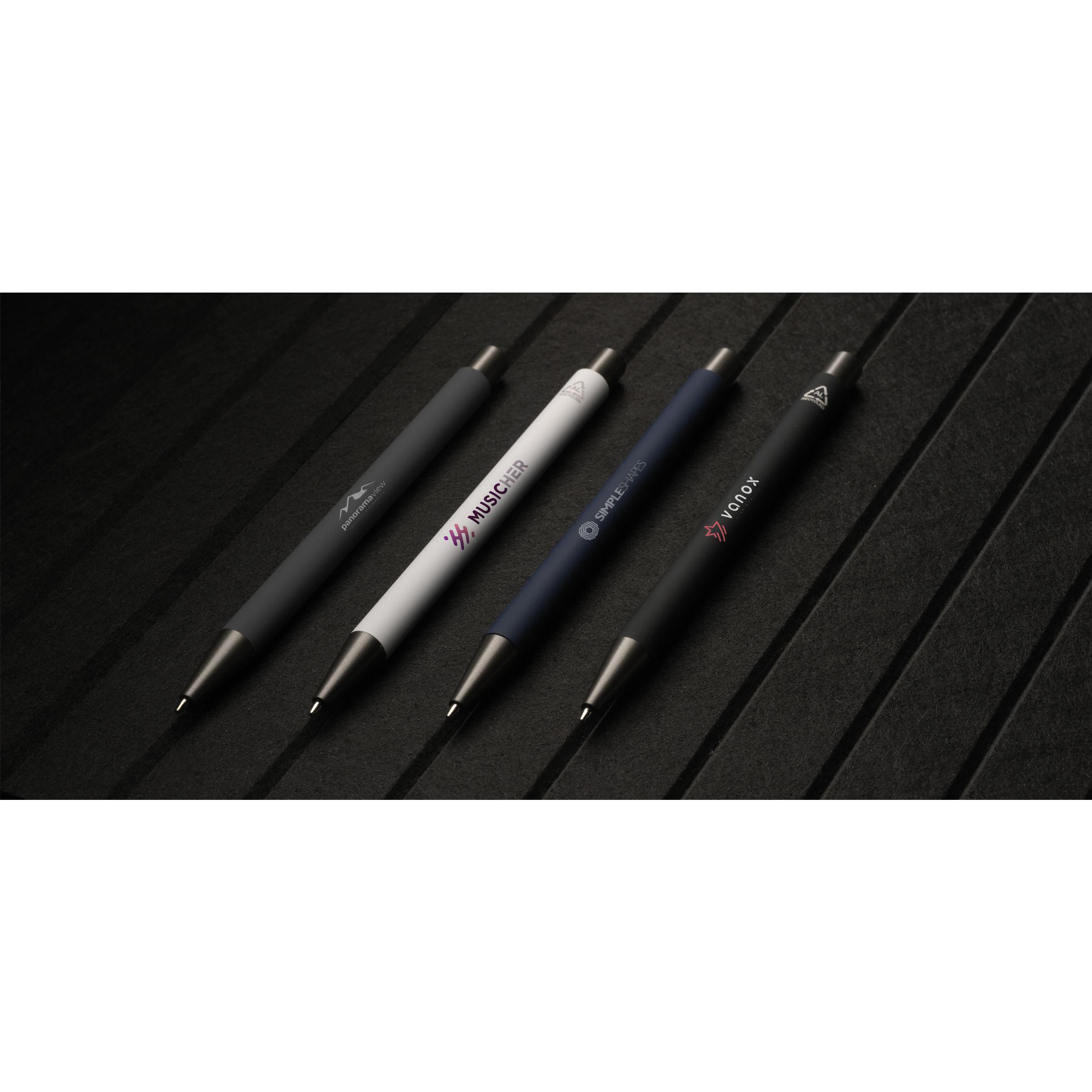 Beschreibung: Blauschreibender Kugelschreiber mit einem Gehäuse aus 100 % GRS-zertifiziertem recyceltem Aluminium. Das Gehäuse ist mit einer gummierten Soft-Touch-Oberfläche versehen. Das schlichte Design ohne Clip verleiht dem Stift ein modernes, elegantes Aussehen. RCS-zertifiziert. Gesamtes recyceltes Material: 81%.Durch die Verwendung von recyceltem Aluminium werden bei der Herstellung dieses Produkts weniger neue Rohstoffe verwendet. Das bedeutet weniger Energieverbrauch und weniger Wasserverbrauch.