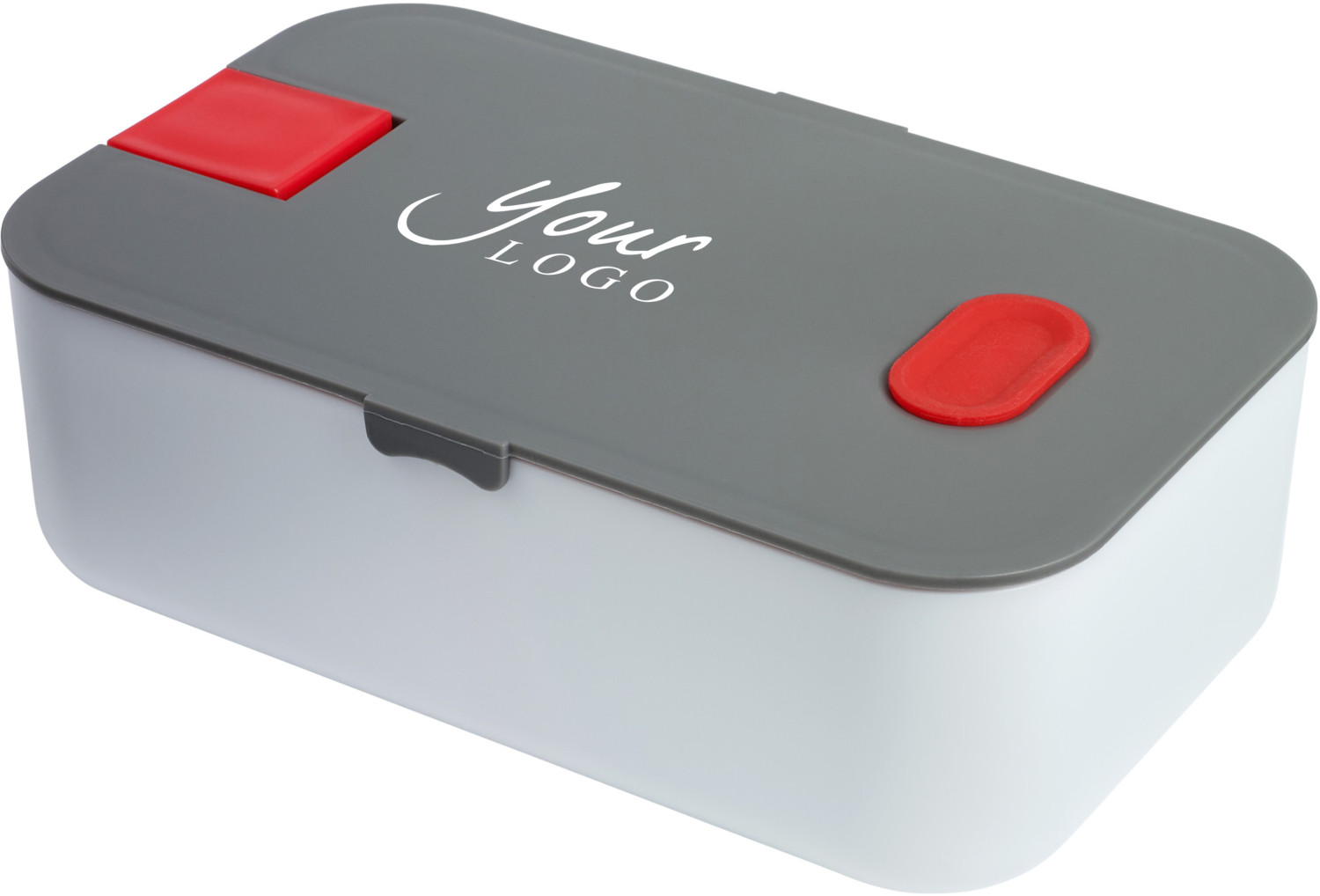 Brotdose (ca. 850 ml) aus Silikon und Kunststoff, trennbares Innenfach, mit farbigen Applikationen. Der Deckel kann als Handyhalter benutzt werden. Nicht spülmaschinengeeignet.