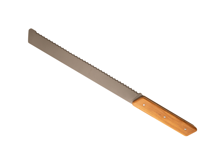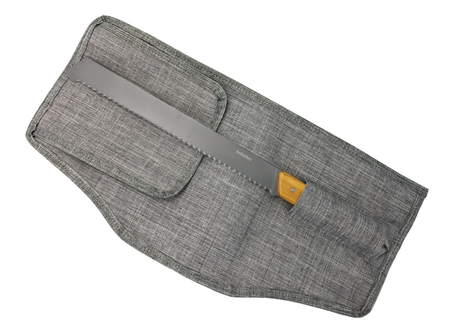 Brotmesser mit gezahnter Klinge aus 420er Edelstahl für den Lebensmittelgebrauch (martensitischer Stahl gemäß EN10088-2 2005) und Titan-Finish. Griff aus Olivenholz. Wird mit einer melierten grauen Rolltasche aus recyceltem RPET geliefert. Warnung: Dieses Produkt ist nicht spülmaschinengeeignet. Die Vorteile in Kürze: - Klinge aus martensitischen 420er Edelstahl (mit Titan-Finish), für optimale Festigkeit und perfekte Lebensmittelkonformität. - Die breite und abgerundete Mikroverzahnung der Klinge ist speziell für eine optimale Brotschneidleistung konzipiert und minimiert Krümelbildung. - Griff aus Olivenholz, das diesem Messer einen authentischen und regionalen Charakter verleiht. - Präsentiert in einer Rolltasche aus recyceltem RPET, um das Messer zu schützen und es überall mitnehmen zu können, sogar im Urlaub!