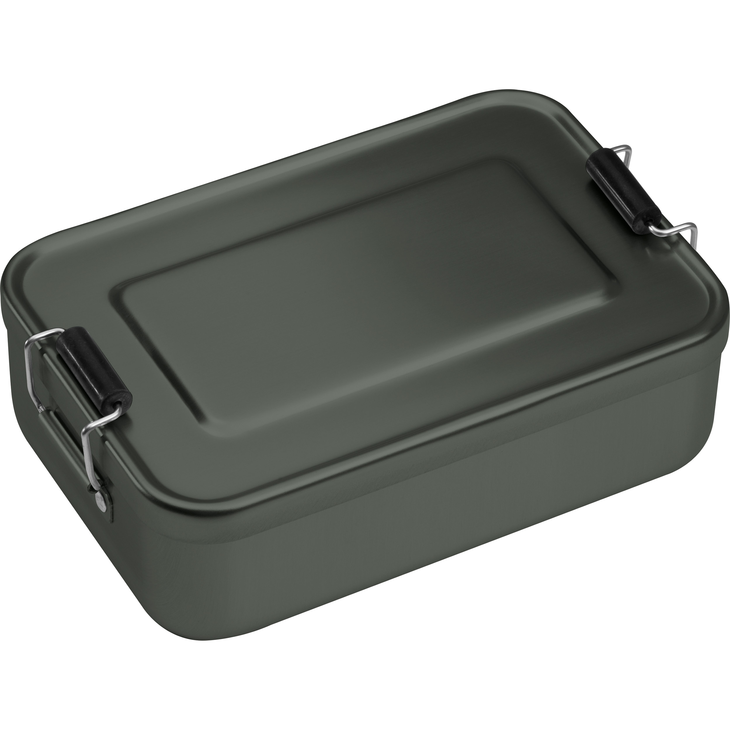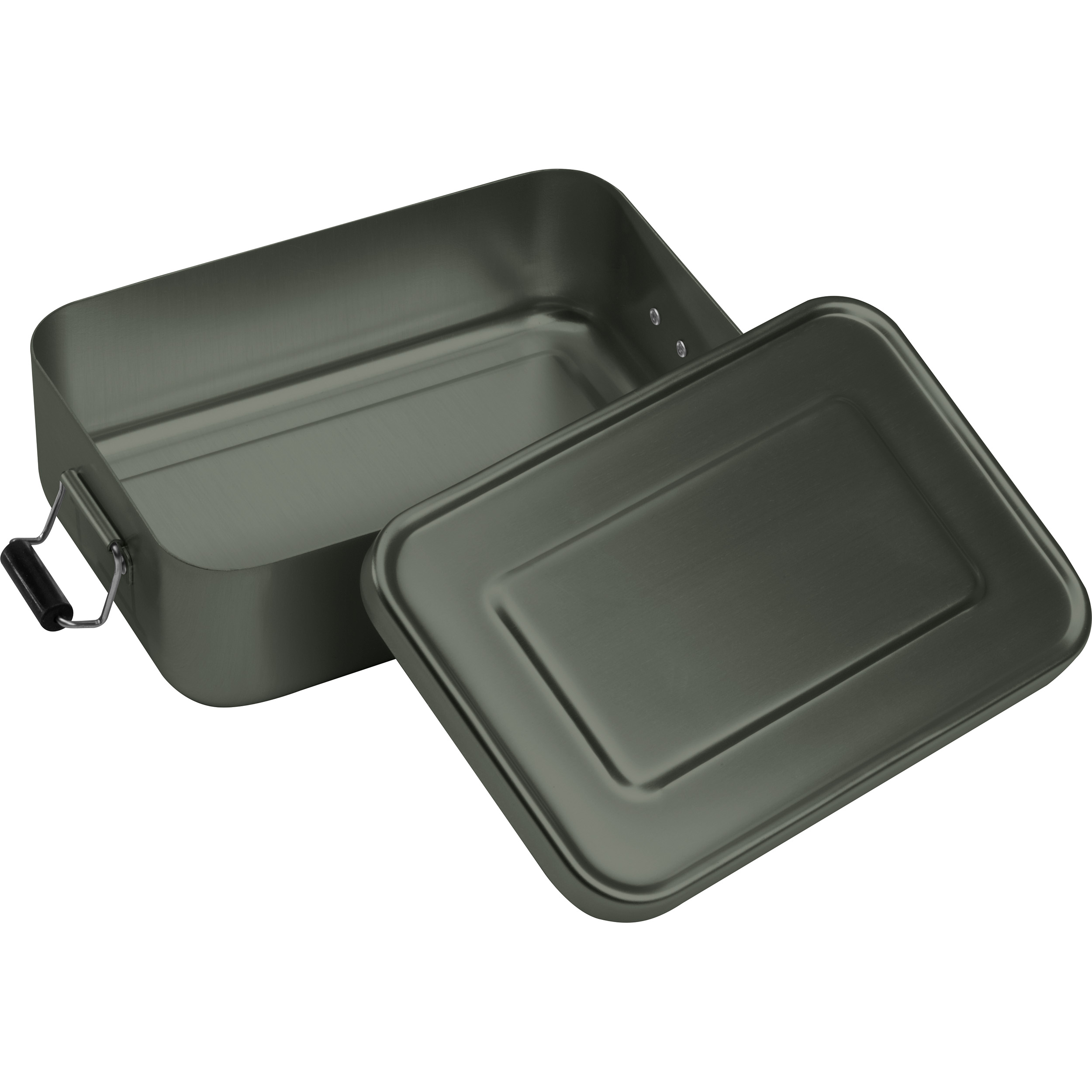 Robuste und langlebige Brotzeitdose aus Metall mit beidseitigen Klemmbügeln für einen sicheren Transport. Ihre Werbung wird auf die Oberseite graviert.
