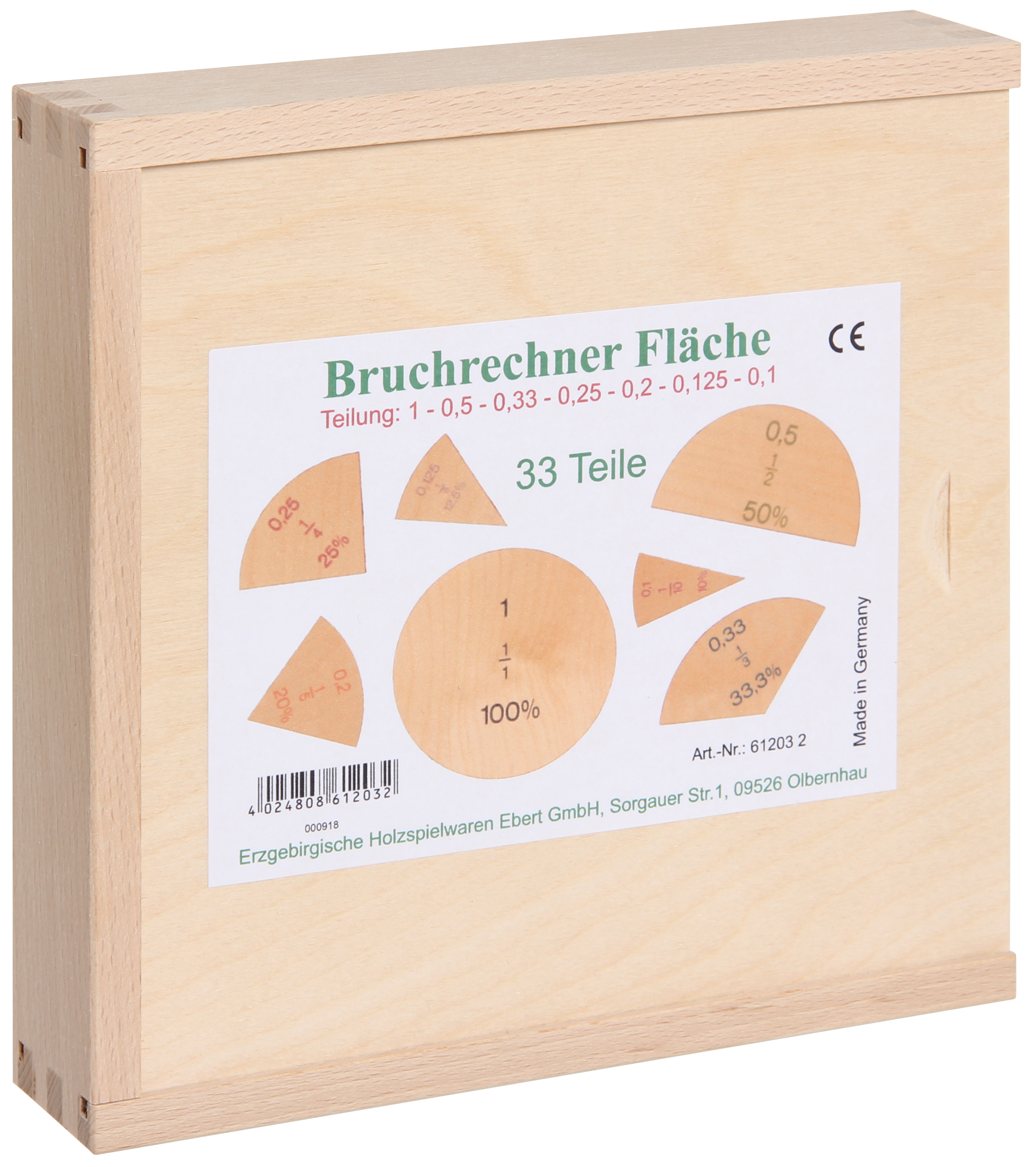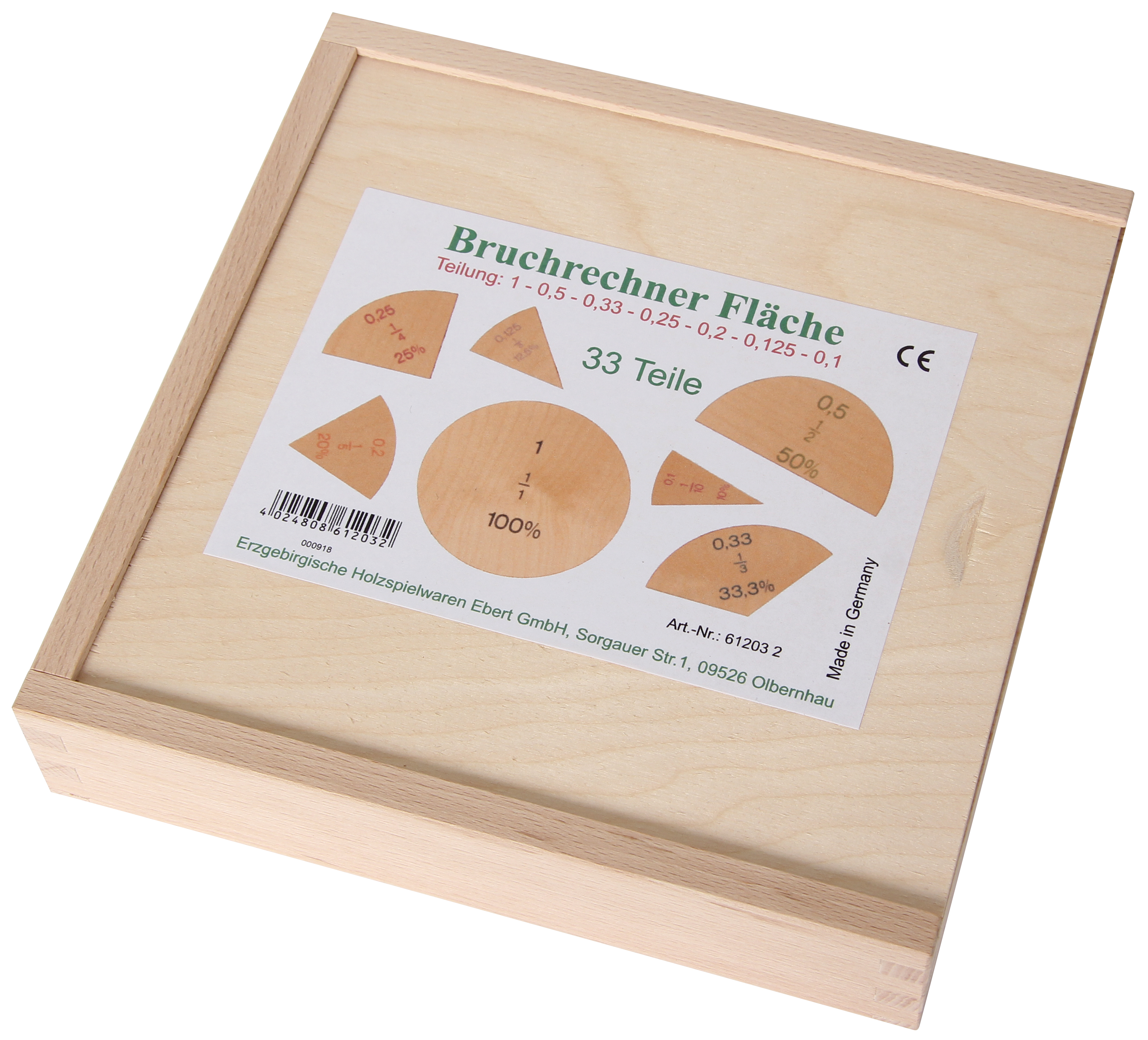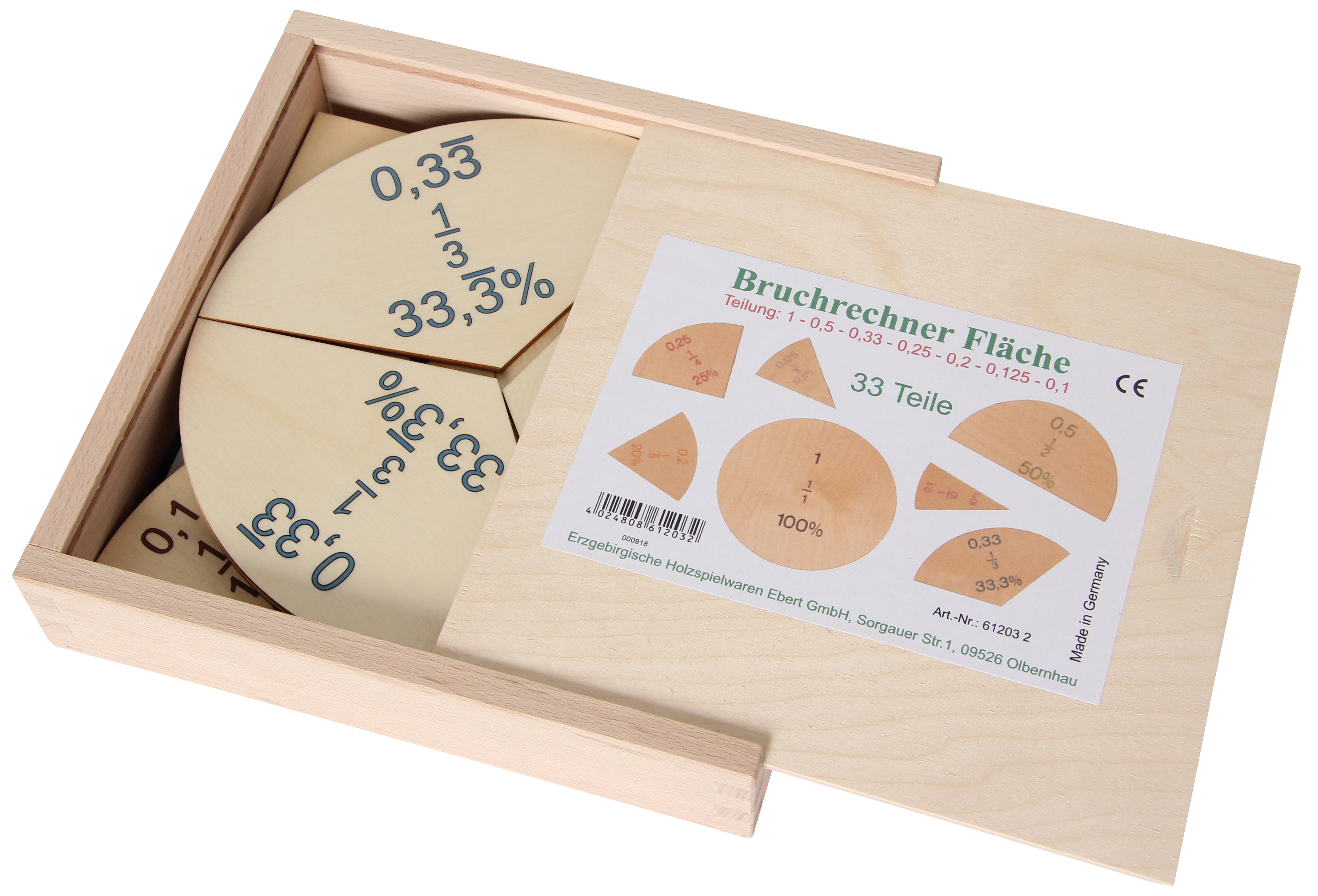 Begreifbares Lernspiel aus Holz. Mit den 33 Teilen aus massivem Buchenholz können Teilmengen begreifbar erklärt werden. Einteilung: 1 - 0,5 - 0,33 - 0,25 - 0,2 - 0,125 - 0,1 Jedes Stück zeigt die Prozent, die Zahl und den Bruch, z. B.: 50% - 0,5 - 1/2 Praktisch verstaut in hochwertigem Holzkasten. Made in Germany.