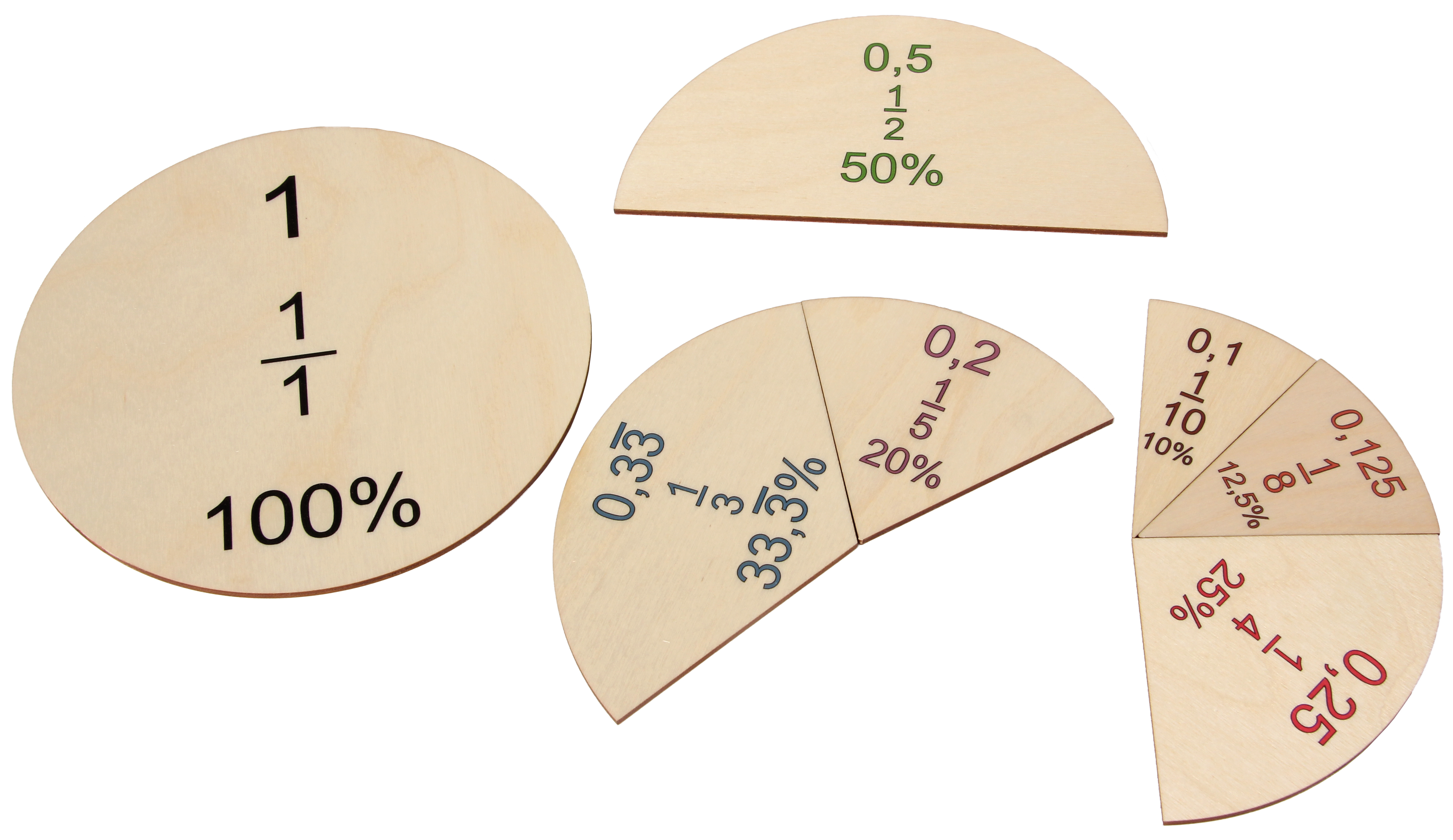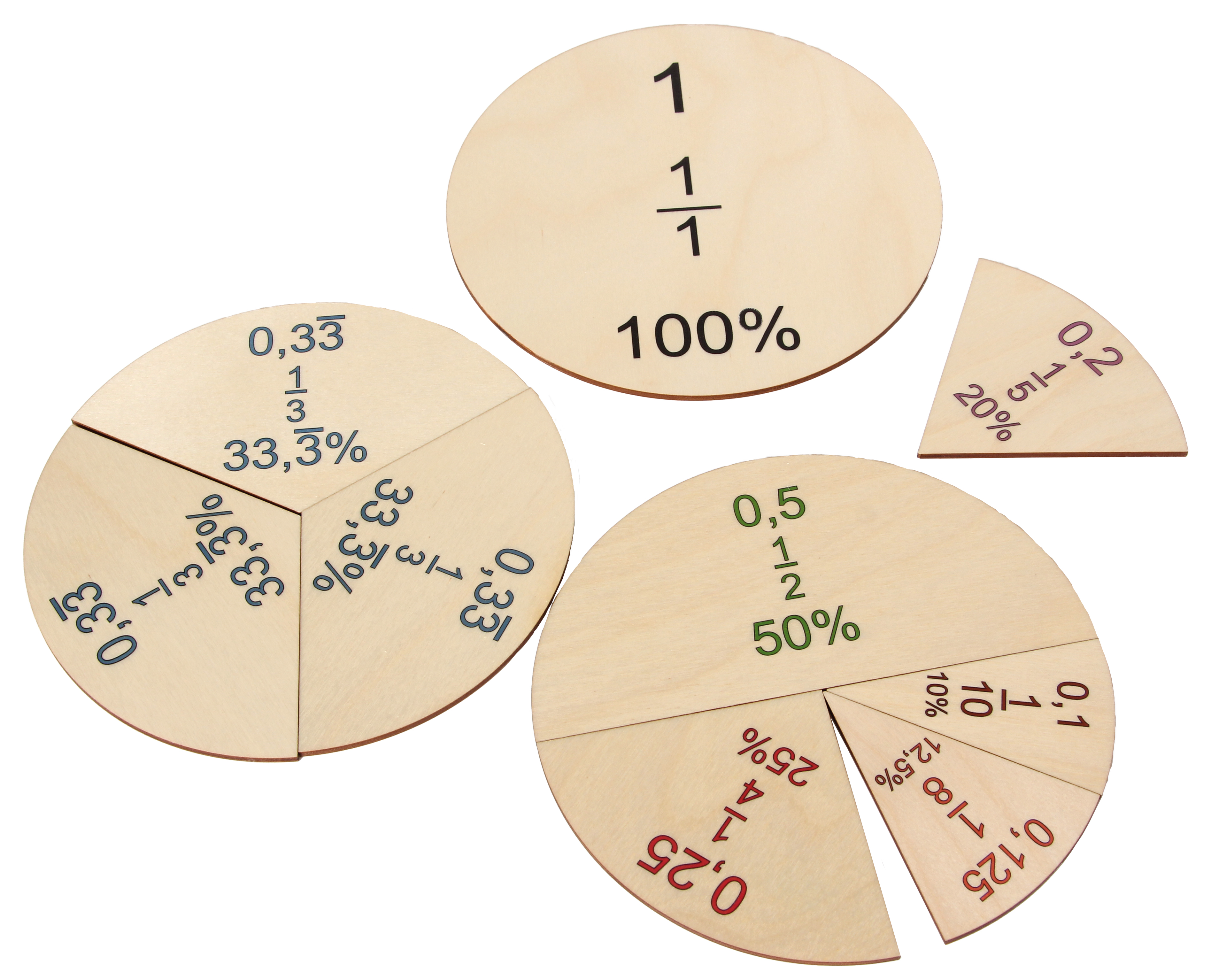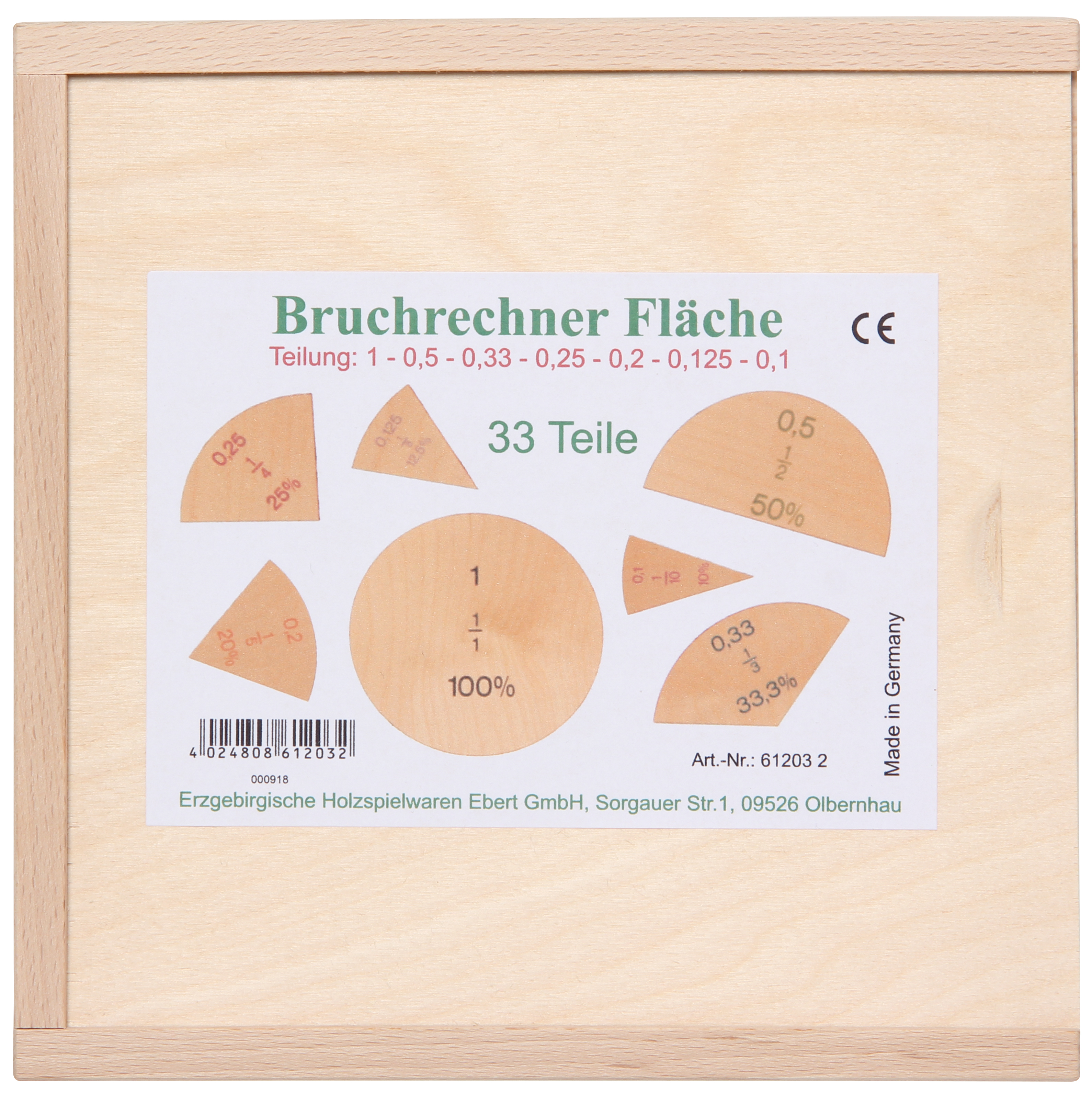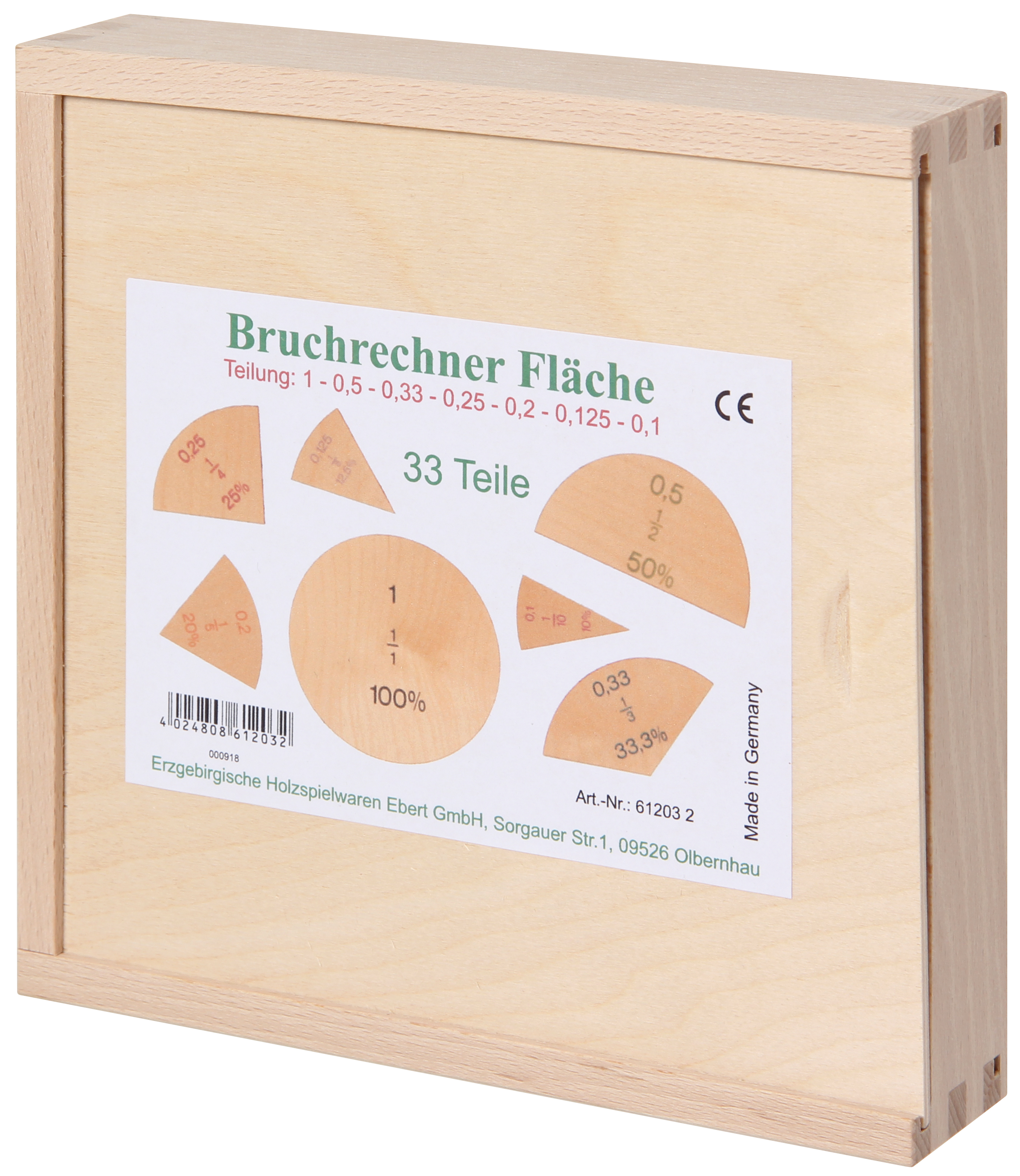 Begreifbares Lernspiel aus Holz. Mit den 33 Teilen aus massivem Buchenholz können Teilmengen begreifbar erklärt werden. Einteilung: 1 - 0,5 - 0,33 - 0,25 - 0,2 - 0,125 - 0,1 Jedes Stück zeigt die Prozent, die Zahl und den Bruch, z. B.: 50% - 0,5 - 1/2 Praktisch verstaut in hochwertigem Holzkasten. Made in Germany.