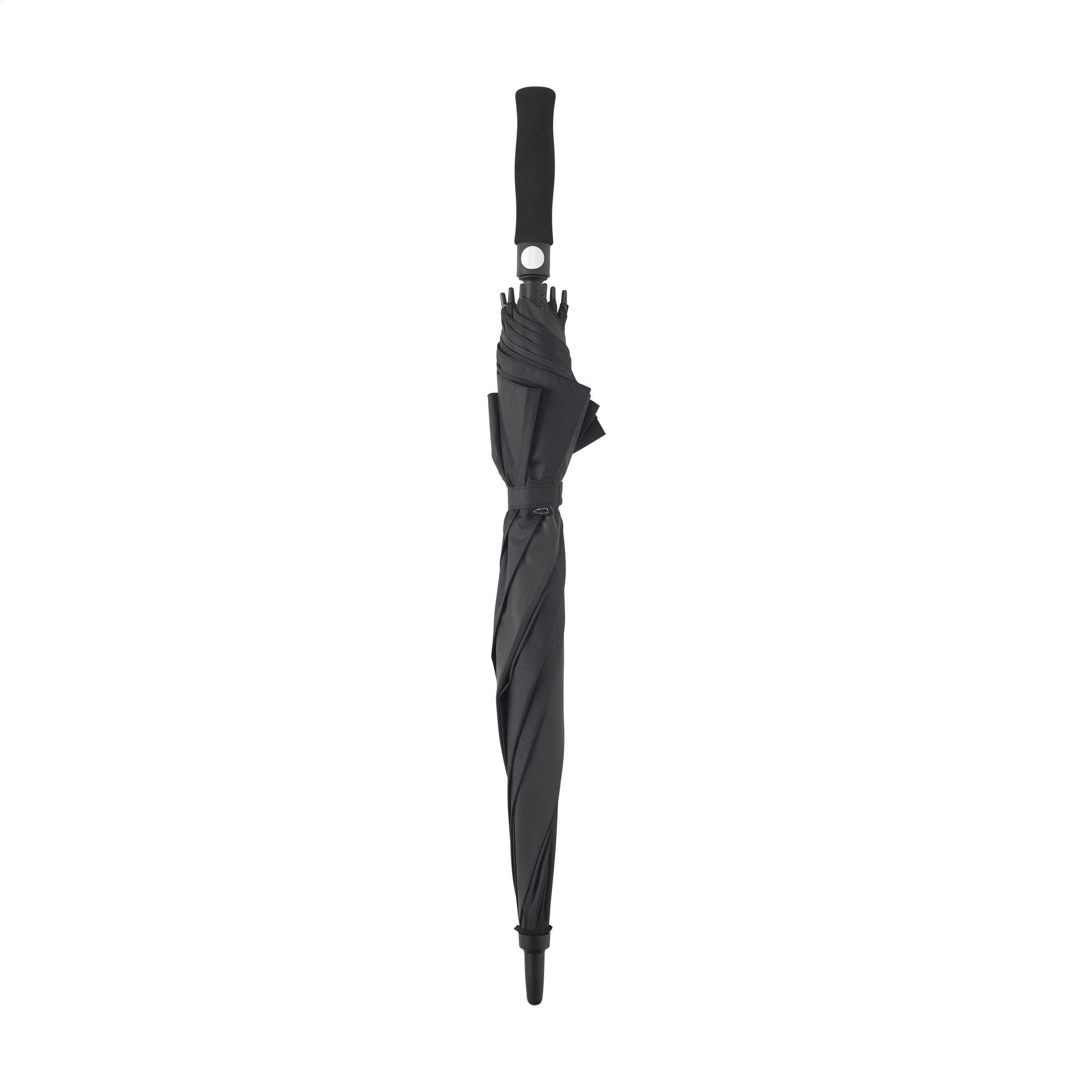 Regenschirm mit 190T RPET Pongee-Polyester-Bespannung. Der Regenschirm verfügt über 2 diskrete, reflektierende Segmente, die sich bei Tageslicht harmonisch in das Schirmdesign einfügen. Diese reflektierenden Elemente leuchten auf, wenn Licht auf sie fällt, sodass Sie auch bei Dunkelheit gut sichtbar sind. Mit automatischer Teleskopöffnung, Fiberglasrahmen und Metallschaft, weichem EVA-Griff und Klettverschluss. RCS-zertifiziert. Recyceltes Material insgesamt: 17%