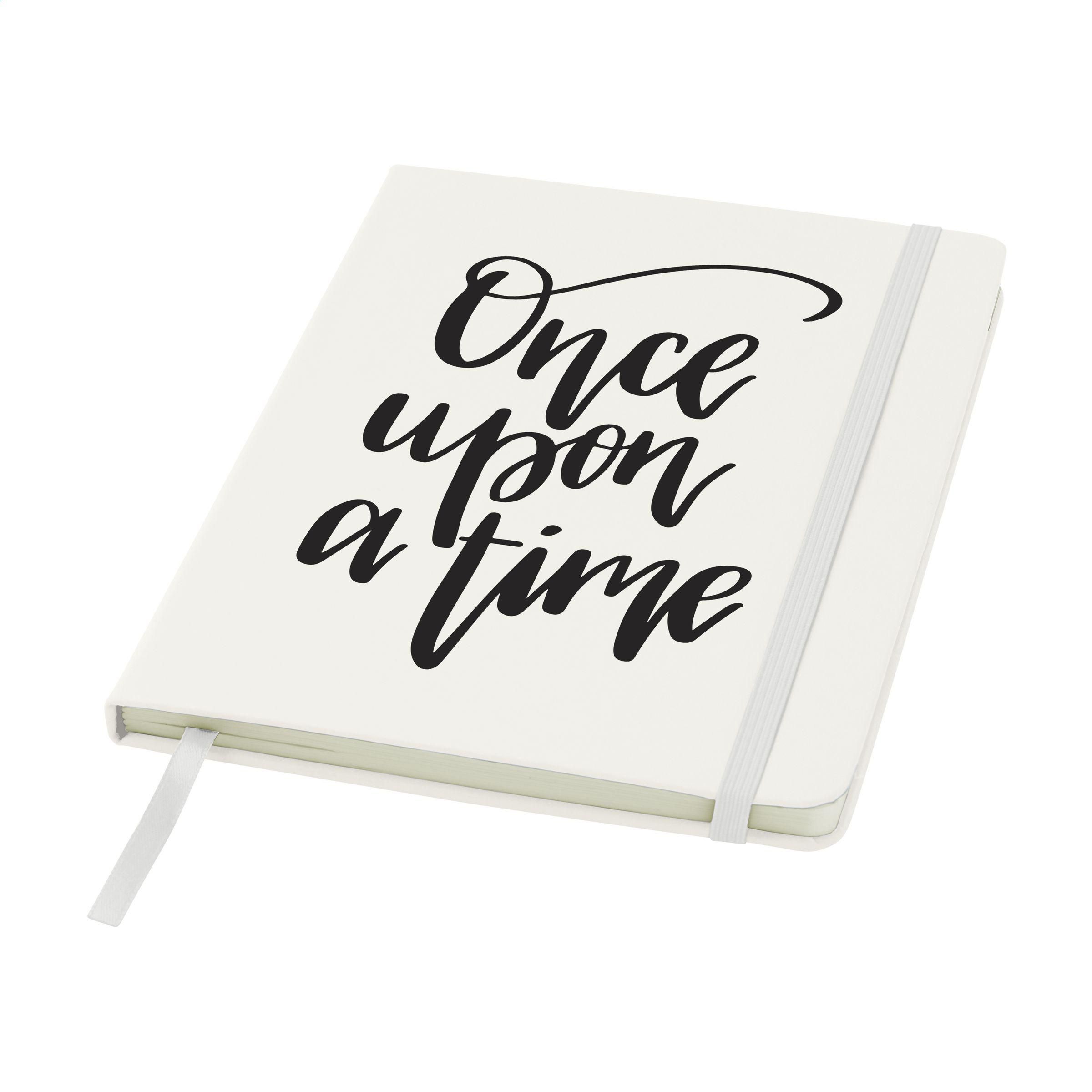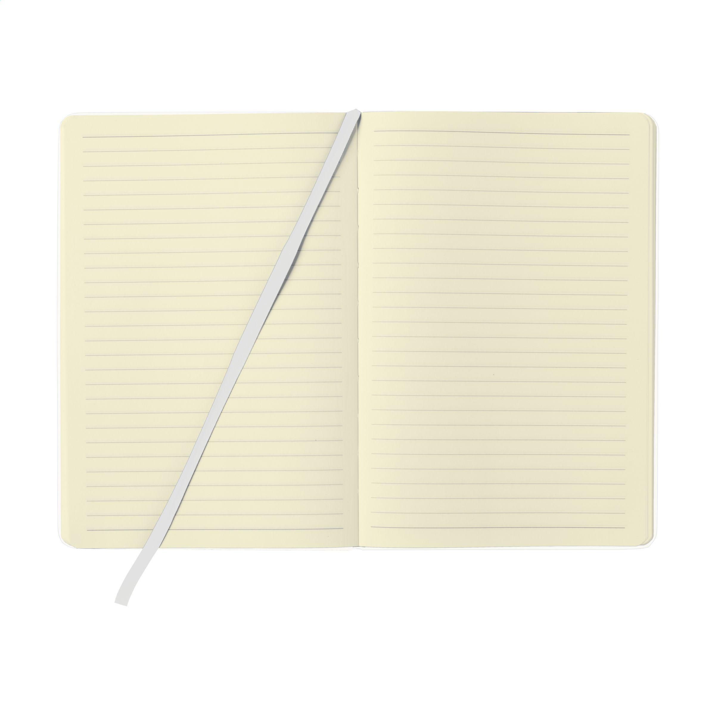 Praktisches Notizbuch im A5-Format. Mit festem PU-Überzug, ca. 80 Seiten cremefarbenem, liniertem FSC Mix zertifiziertes Papier (70 g/m²), elastischem Verschluss und Leseband.
