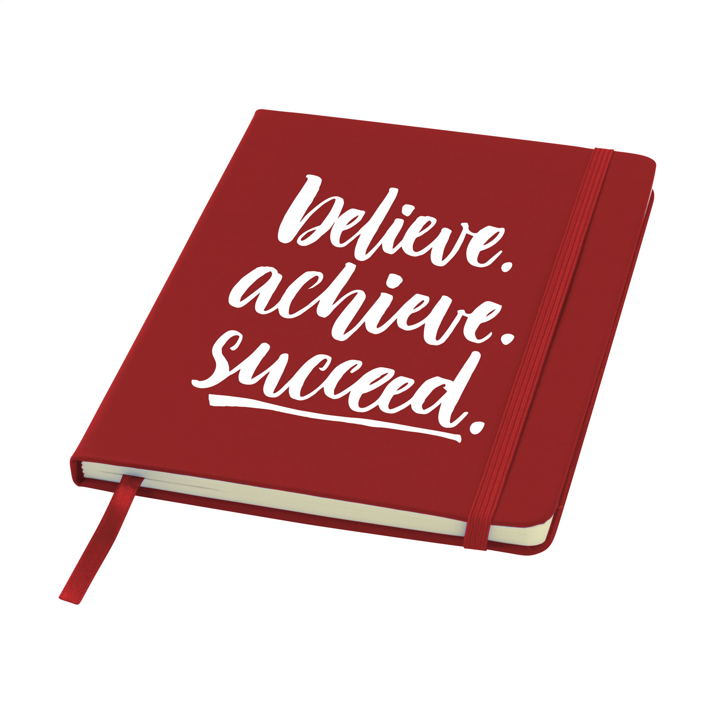 Praktisches Notizbuch im A5-Format. Mit festem PU-Überzug, ca. 80 Seiten cremefarbenem, liniertem FSC Mix zertifiziertes Papier (70 g / m²), elastischem Verschluss und Leseband.