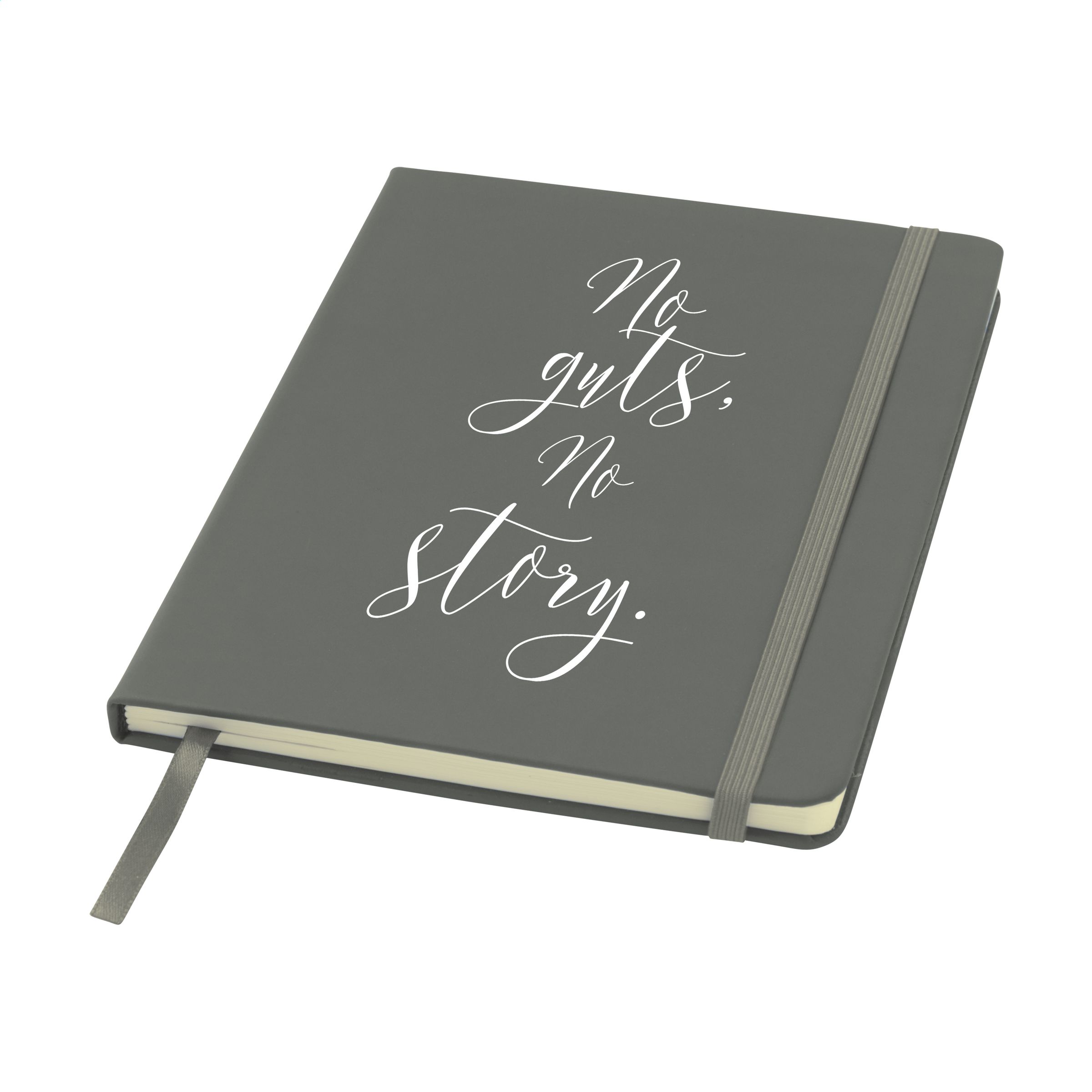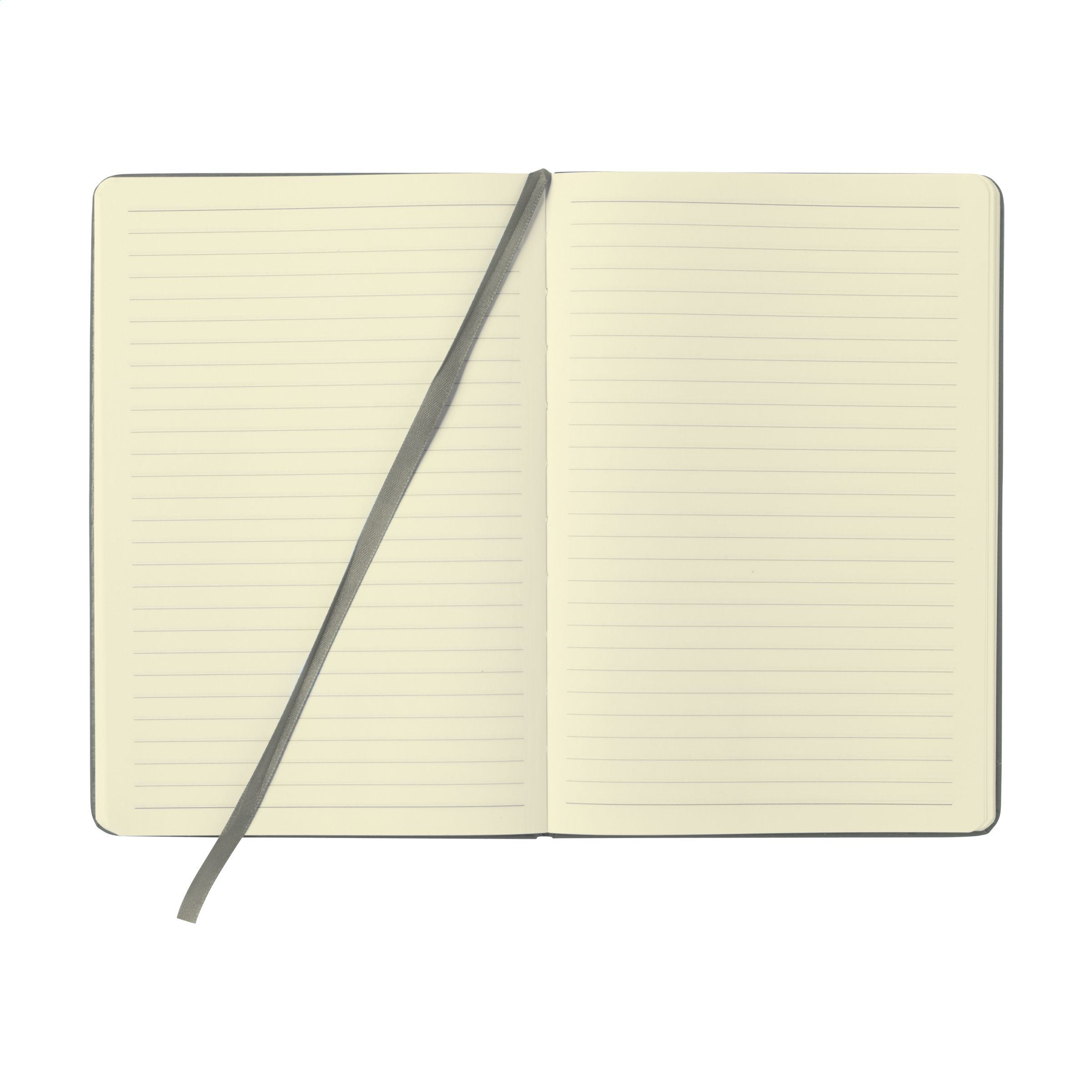 Praktisches Notizbuch im A5-Format. Mit festem PU-Überzug, ca. 80 Seiten cremefarbenem, liniertem FSC Mix zertifiziertes Papier (70 g / m²), elastischem Verschluss und Leseband.