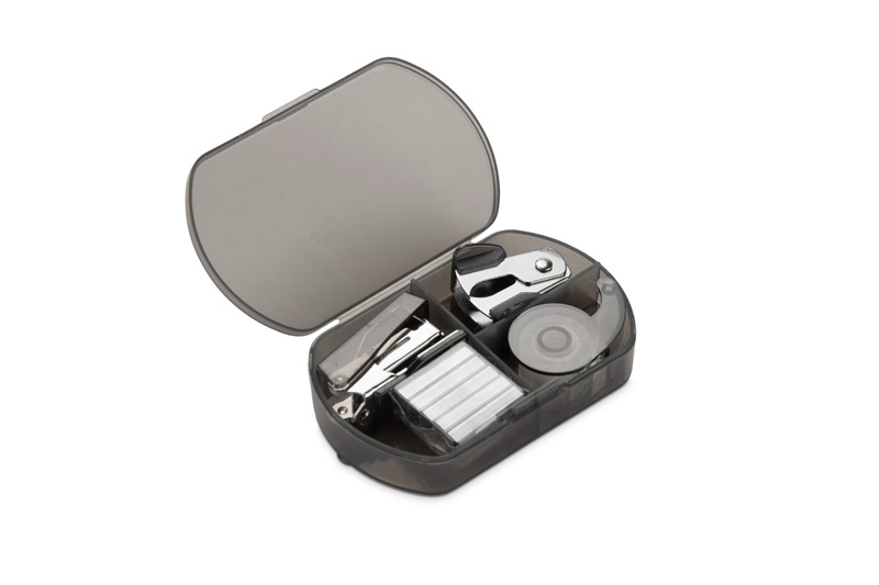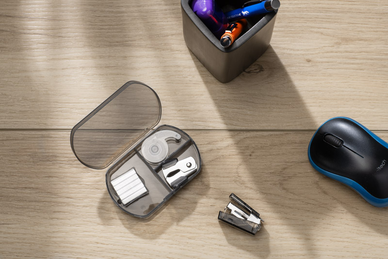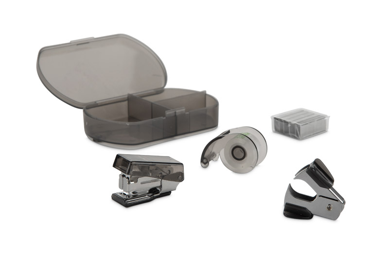 Das DOCSY-Office-Kit ist eine kompakte Lösung mit dem nötigsten Zubehör: Mini-Hefter, Mini-Locher, Klebeband und ein Vorrat an Heftklammern - alles in einem praktischen Kunststoffkoffer. Ideal für den Einsatz im Außendienst, auf einem kleinen Schreibtisch oder als praktisches Werbegeschenk für den Büro- und Bildungsbereich.