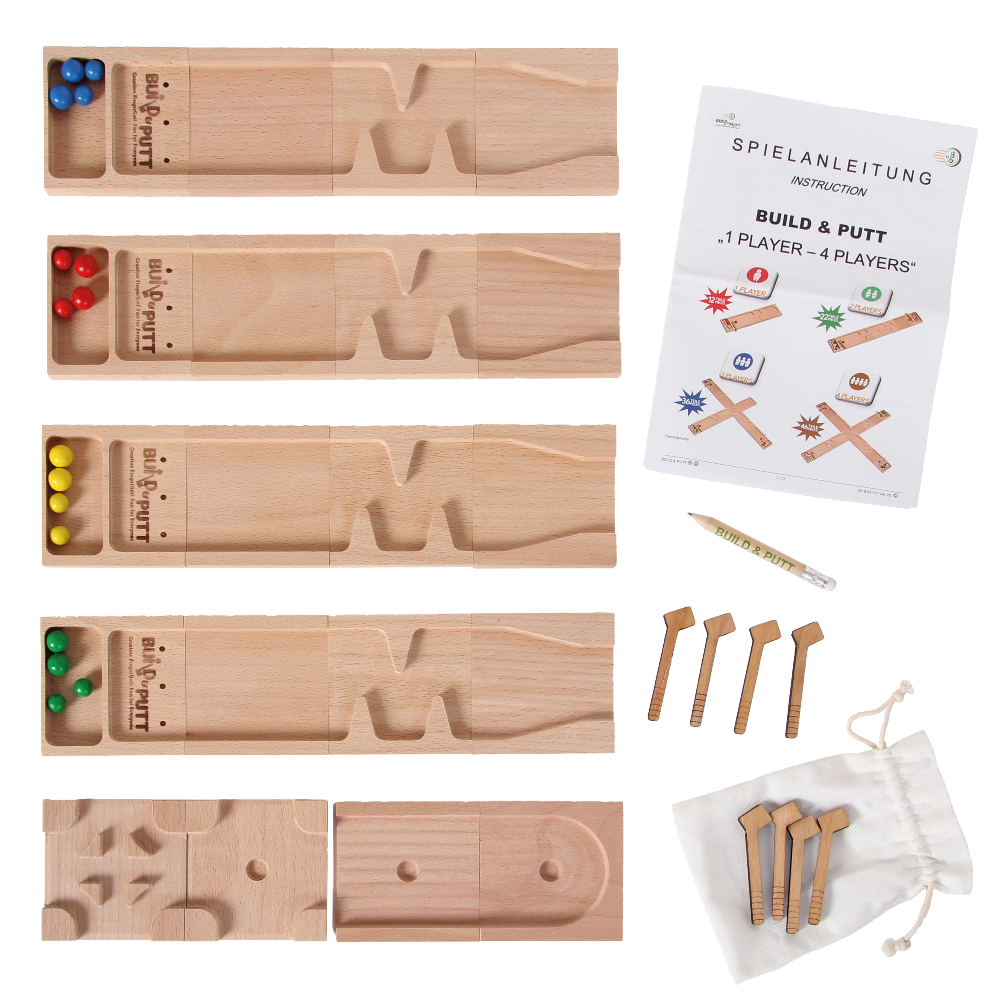 Kreativer FingerGolf-Spaß für alle! Minigolf begeistert seit Generationen Groß und Klein. Build & Putt bringt den Freizeitspaß an den Familientisch! Als ein pädagogisch sinnvolles Geschicklichkeitsspiel aus wieder verwertbaren Materialien, dei dem Kreativität, Konzentration und Feinmotorik alleine oder im Team gemeinsam gefördert werden. Unterschiedliche Spielstärken können einfach ausgeglichen werden. 46-teilig. Made in Austria.