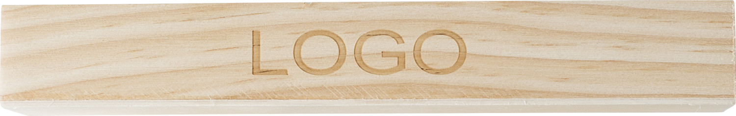 Buntstiftset in Holzbox, Deckel mit Linealaufdruck, 12-tlg., mit Kunststoff-Anspitzer, Radiergummi und lange Buntstiften in verschiedenen Farben.