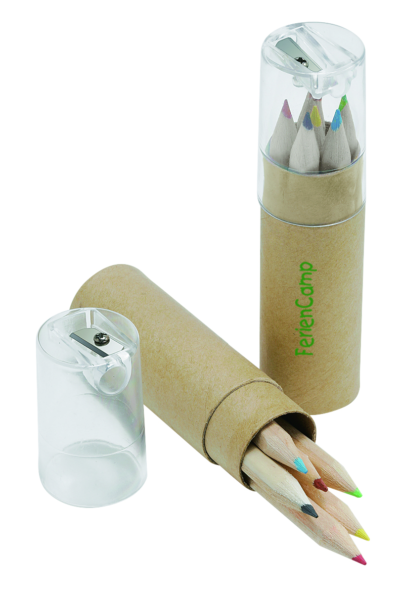 Buntstifte-Set "Alpha" mit integriertem Spitzer im glasklaren Kunststoffdeckel und 6 Mini-Holz-Buntstiften, naturbelassen, sechseckig im Kartonköcher