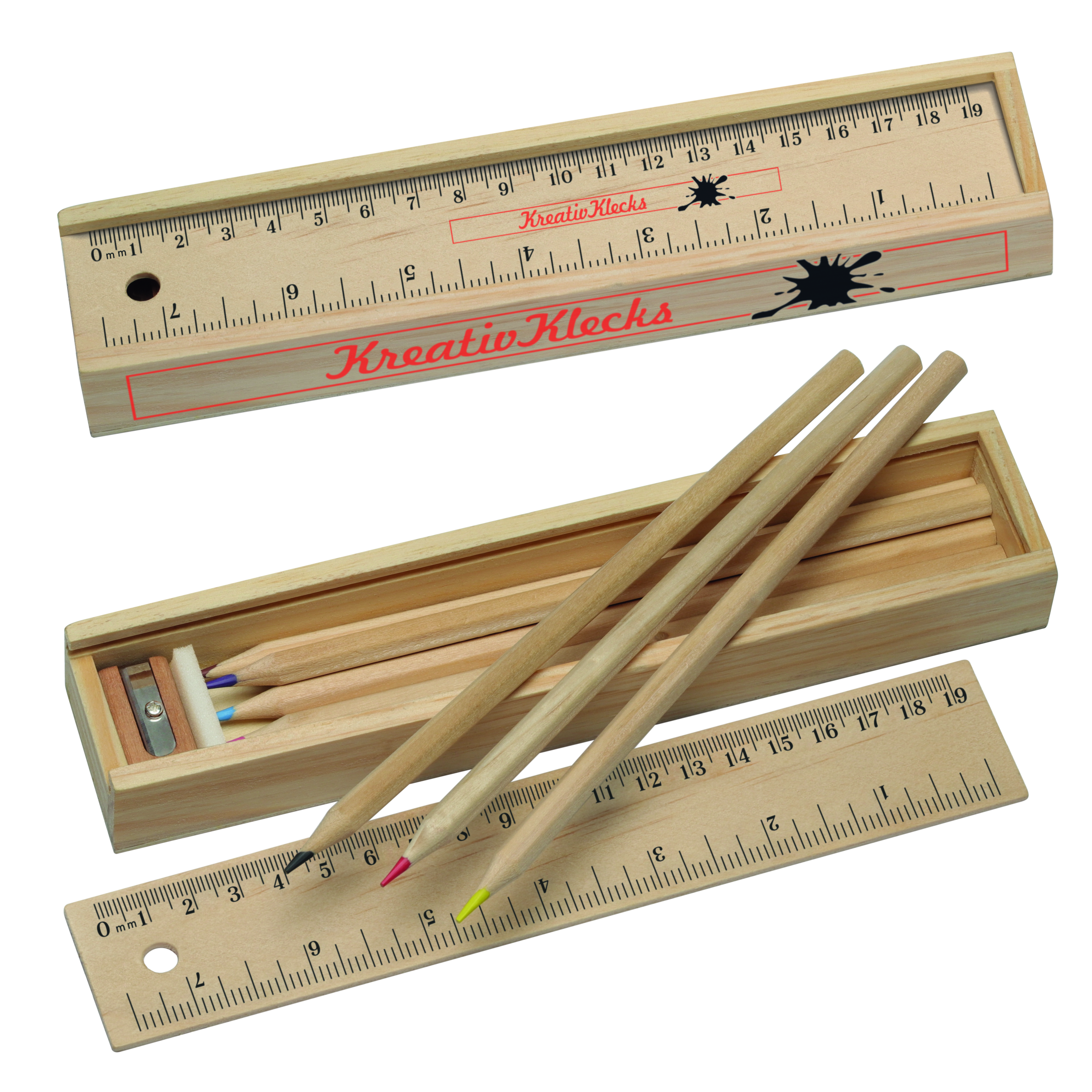 Buntstifte-Set "Beta" 8 naturbelassene, sechseckige Buntstifte, 1 Holz-Spitzer und 1 Lineal mit gedruckter 19 cm und 7,5 Inch Skala in Holzbox. Das Lineal ist gleichzeitg Schiebedeckel der Box.
