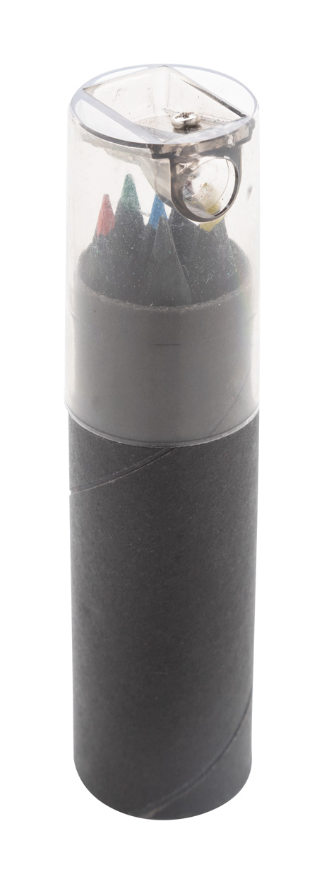 6-teiliges Buntstifteset aus schwarzem Holz in einem runden Etui aus schwarzem Karton mit Kunststoffspitzer.