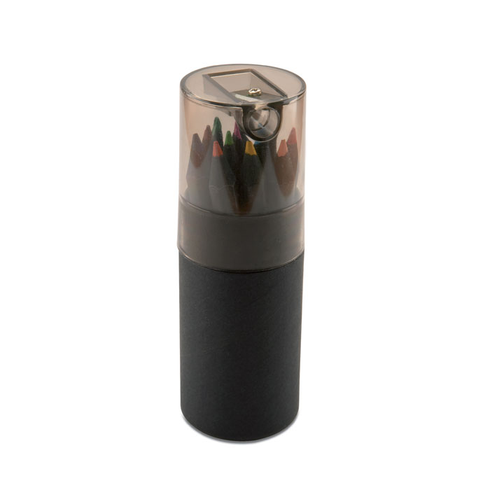 12 Buntstifte in einer schwarzen, runden Kartonbox. Anspitzer im Deckel der Box integriert. FSC®-certified | FSC 100%, P5.1, W17.2, FSC-C213206