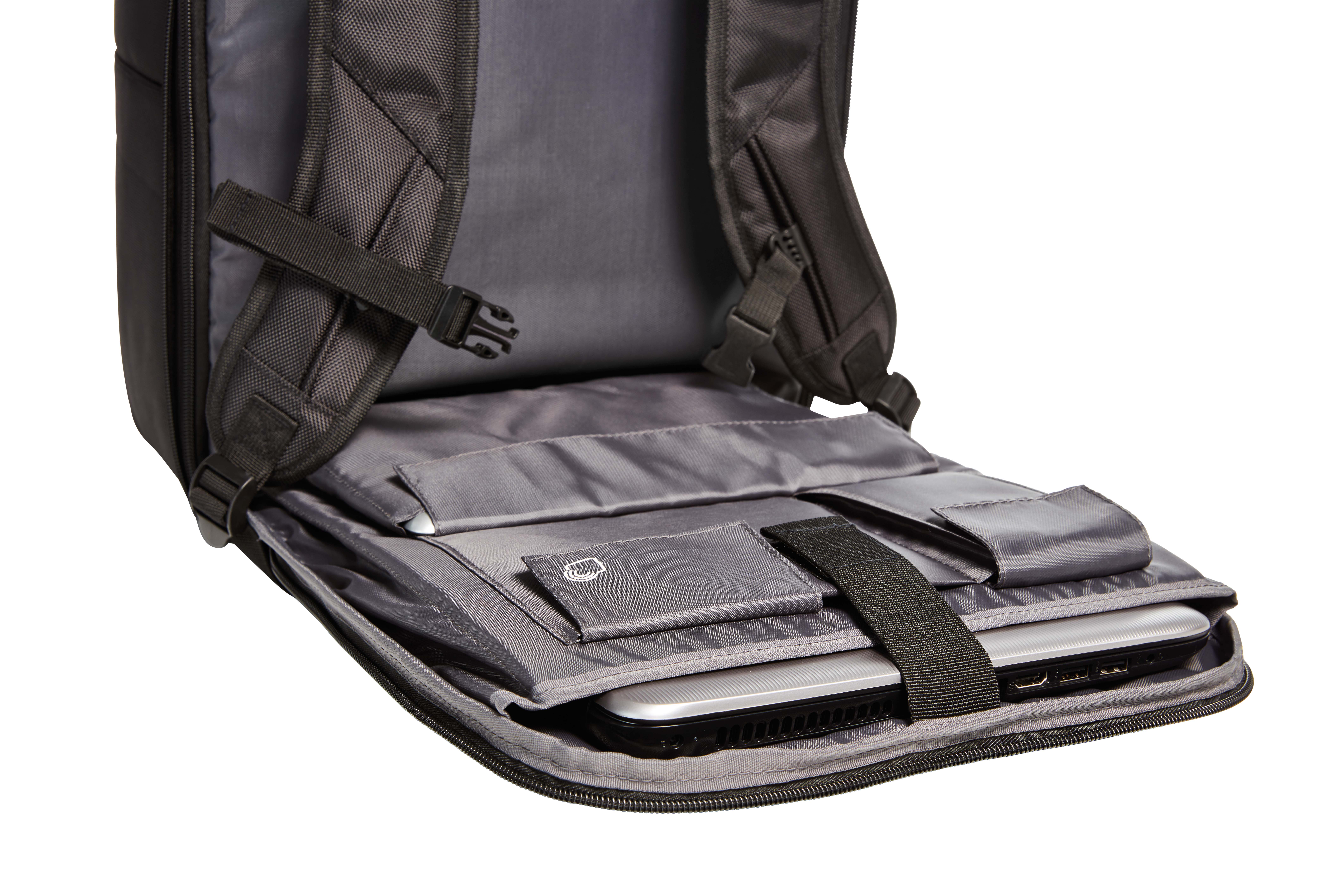 Gepolsterter Business-Rrucksack rückseitig abschließbar; gepolstertes Hauptfach mit 3 Reißverschluss-Fächern; gepolsterte Trennwand im Hauptfach mit flachem Einsteckfach geeignet für DIN A4-Unterlagen; gepolstertes Notebookfach innen rückseitig; zusätzlich 3 gepolsterte Einsteckfächer geeignet für Tablet, Handy, sowie ein Fach mit RFID-Abschirmung; vorne zusätzliches Reißverschlussfach mit flachem Einsteckfach; Vortasche mit verstecktem Reißverschluss; gepolsterter Rücken mit verstecktem Reißverschlussfach unterhalb der Polsterung; rückseitige Befestigungsschlaufe für Trolley-Gestänge; längenverstellbare gepolsterte Schultergurte mit höhen- und weitenverstellbarem Brustgurt; gepolsterter Handgriff
