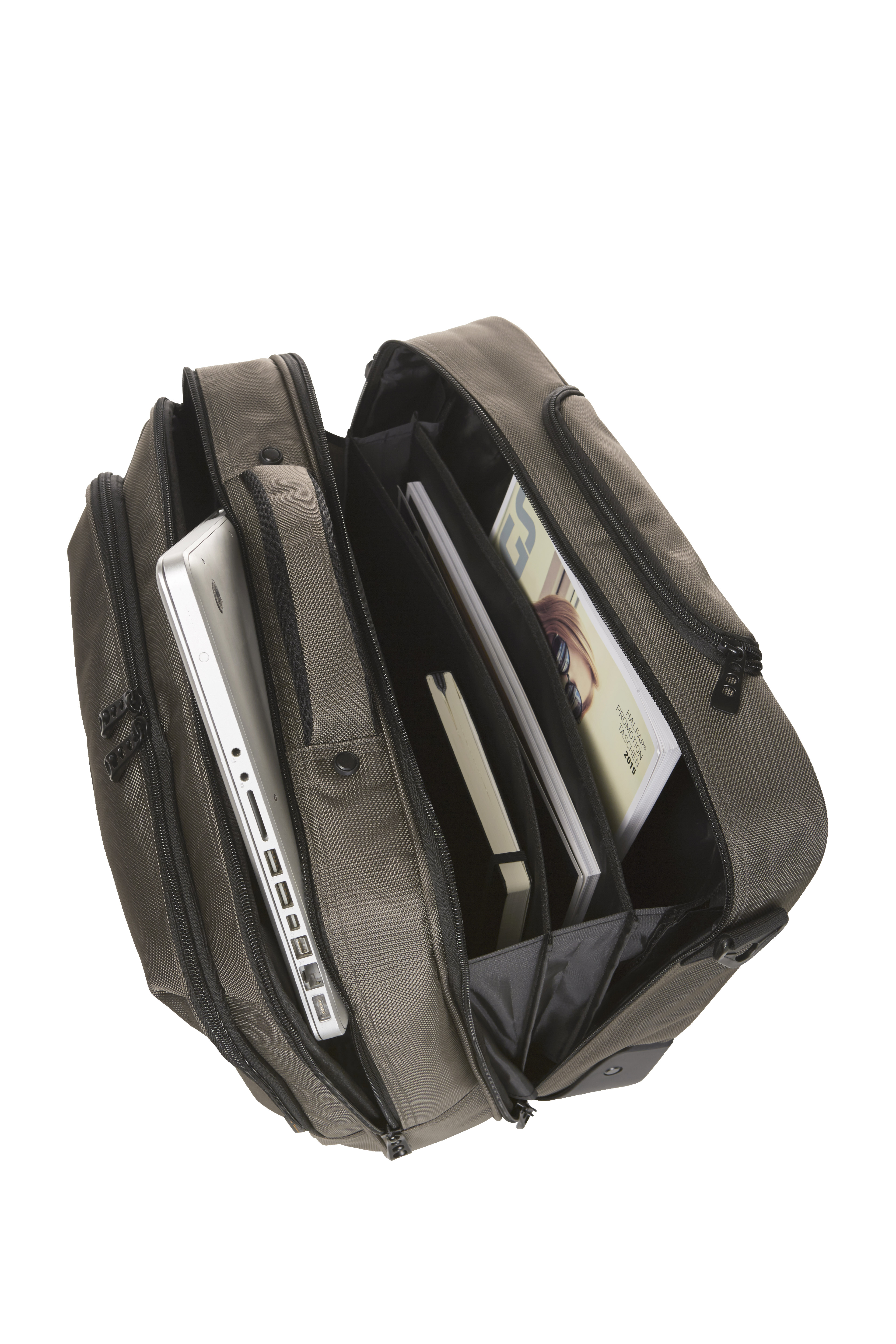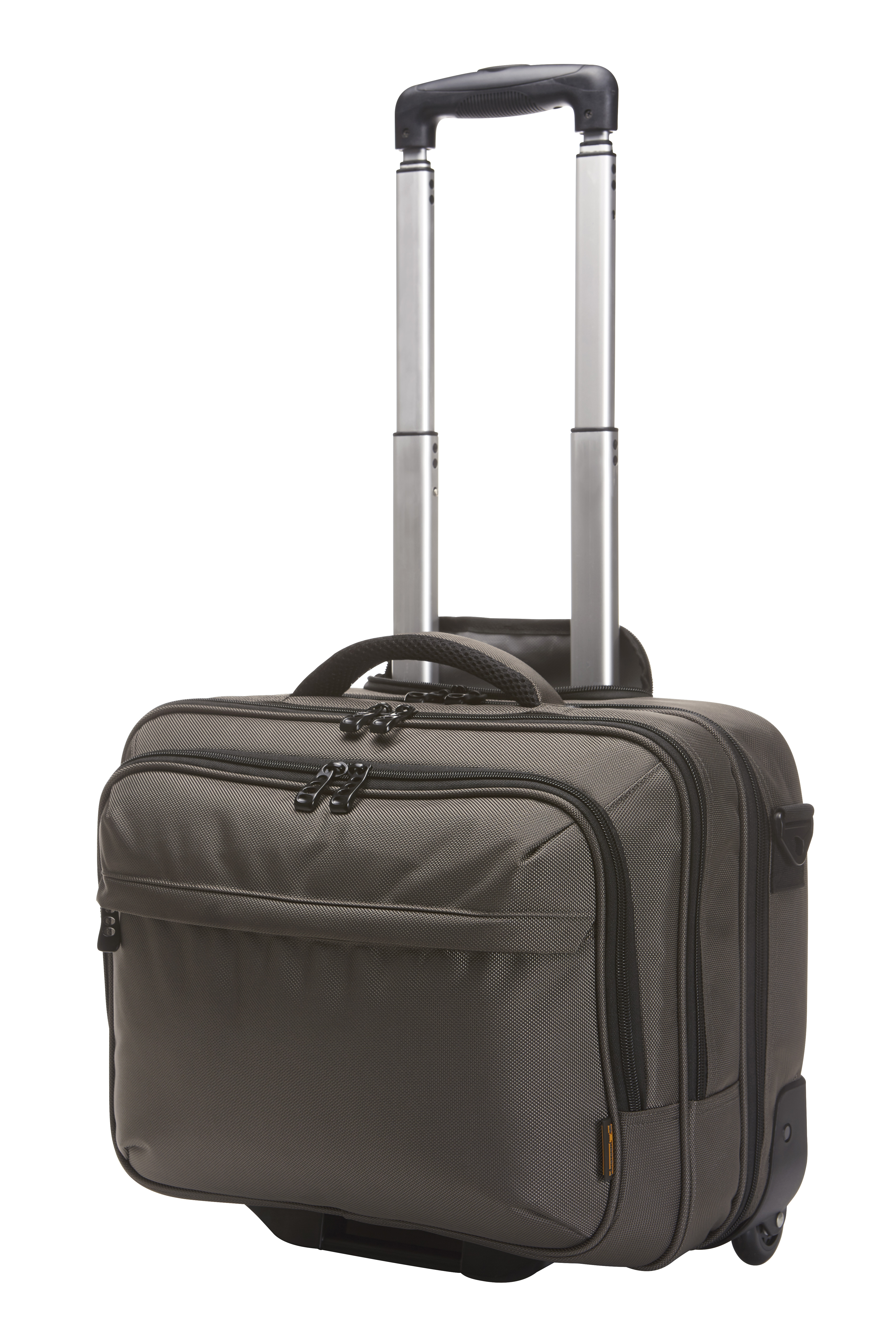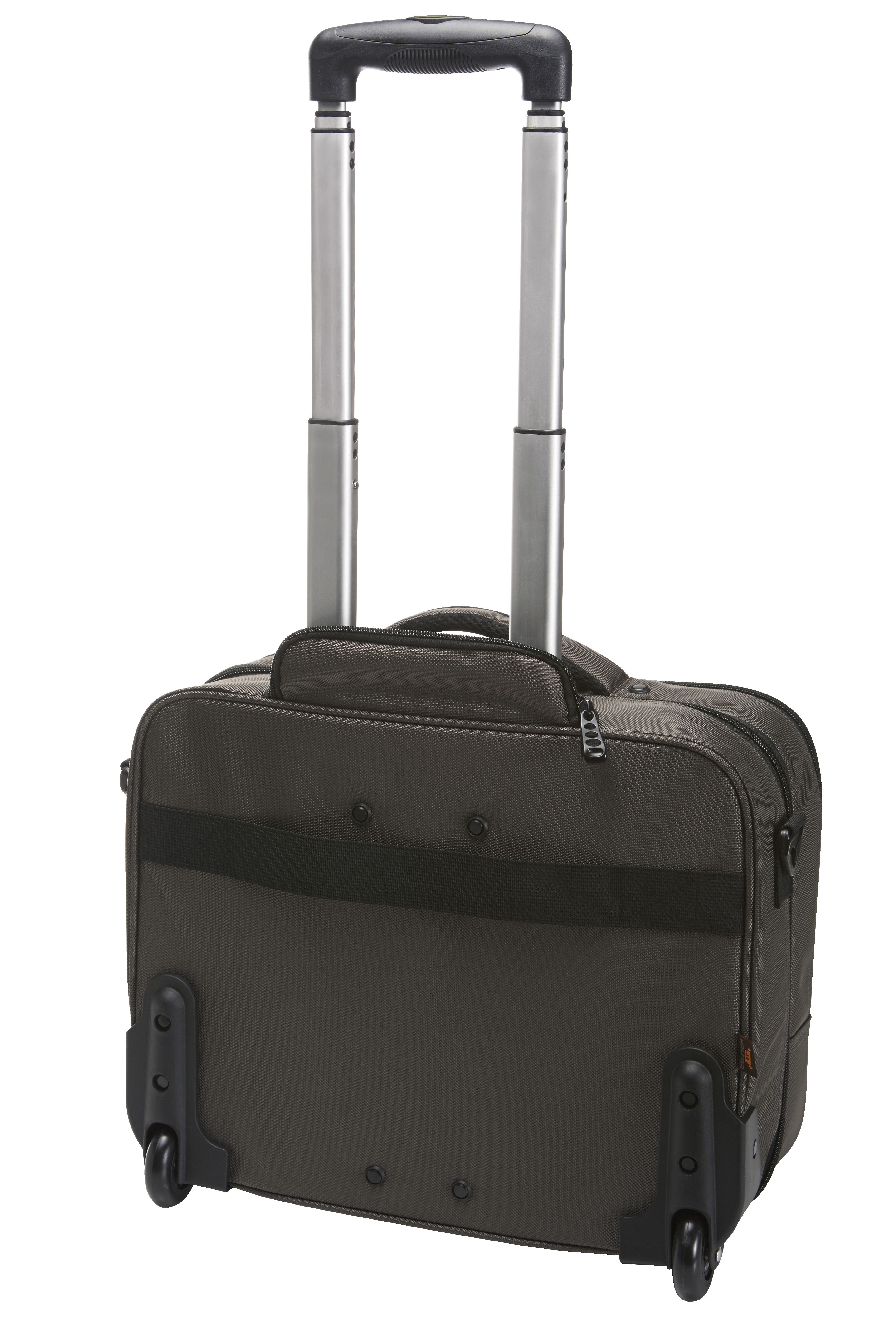 Aufwändig gepolsterter Laptop-Trolley; Reißverschlussfach für Notebook; Dokumenten-Reißverschlussfach mit Separation; Reißverschluss-Vortasche mit Organizer-Elementen; Reißverschluss-Vortasche; Handgriff; abnehmbarer, zweiseitig längenverstellbarer Schultergurt mit genähtem Schulterpolster; rückseitige Befestigungsschlaufe für Gepäck-Trolley; Teleskopgriff