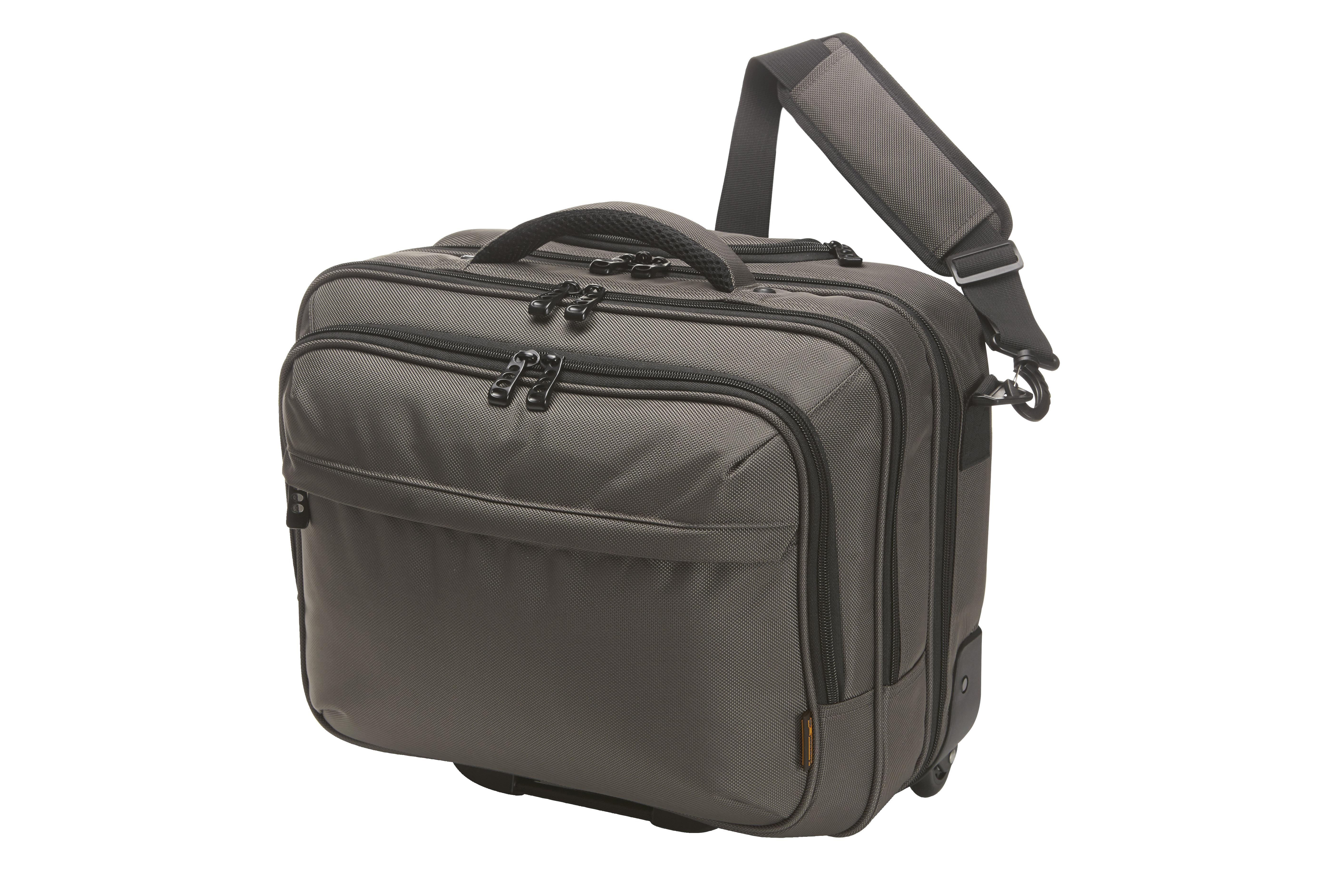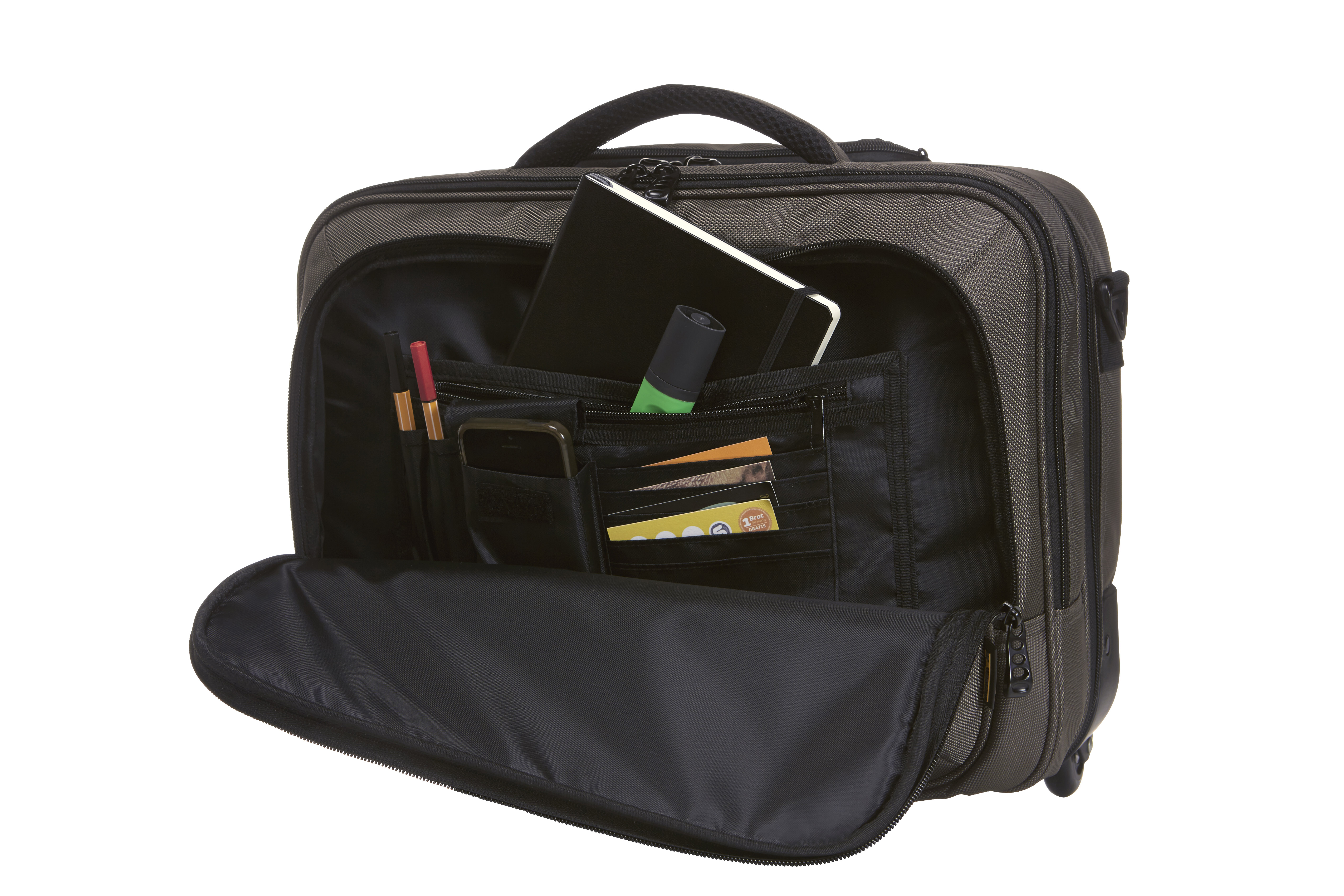 Aufwändig gepolsterter Laptop-Trolley; Reißverschlussfach für Notebook; Dokumenten-Reißverschlussfach mit Separation; Reißverschluss-Vortasche mit Organizer-Elementen; Reißverschluss-Vortasche; Handgriff; abnehmbarer, zweiseitig längenverstellbarer Schultergurt mit genähtem Schulterpolster; rückseitige Befestigungsschlaufe für Gepäck-Trolley; Teleskopgriff