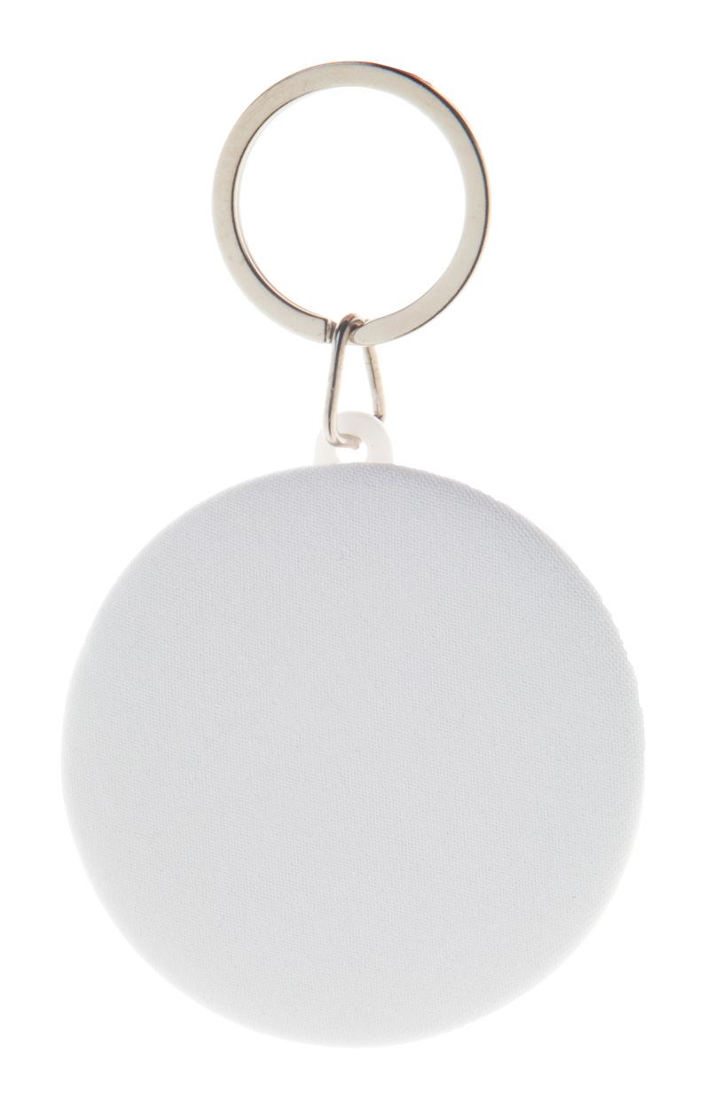 Großer Pin-Button-Schlüsselanhänger mit vollfarbigem RPET-Mikrofaserbezug. Preis einschließlich Sublimationsdruck. MOQ: 100 Stück.