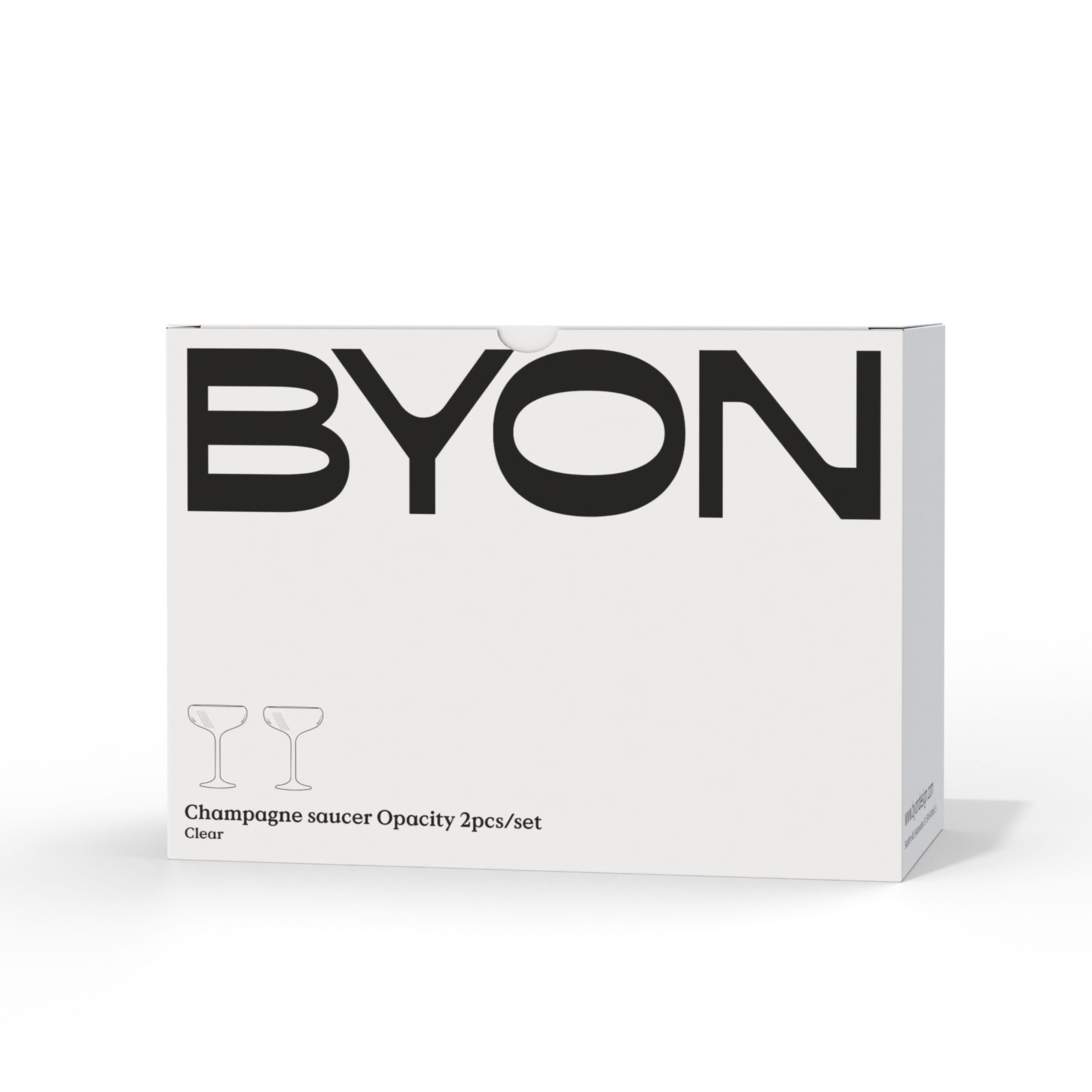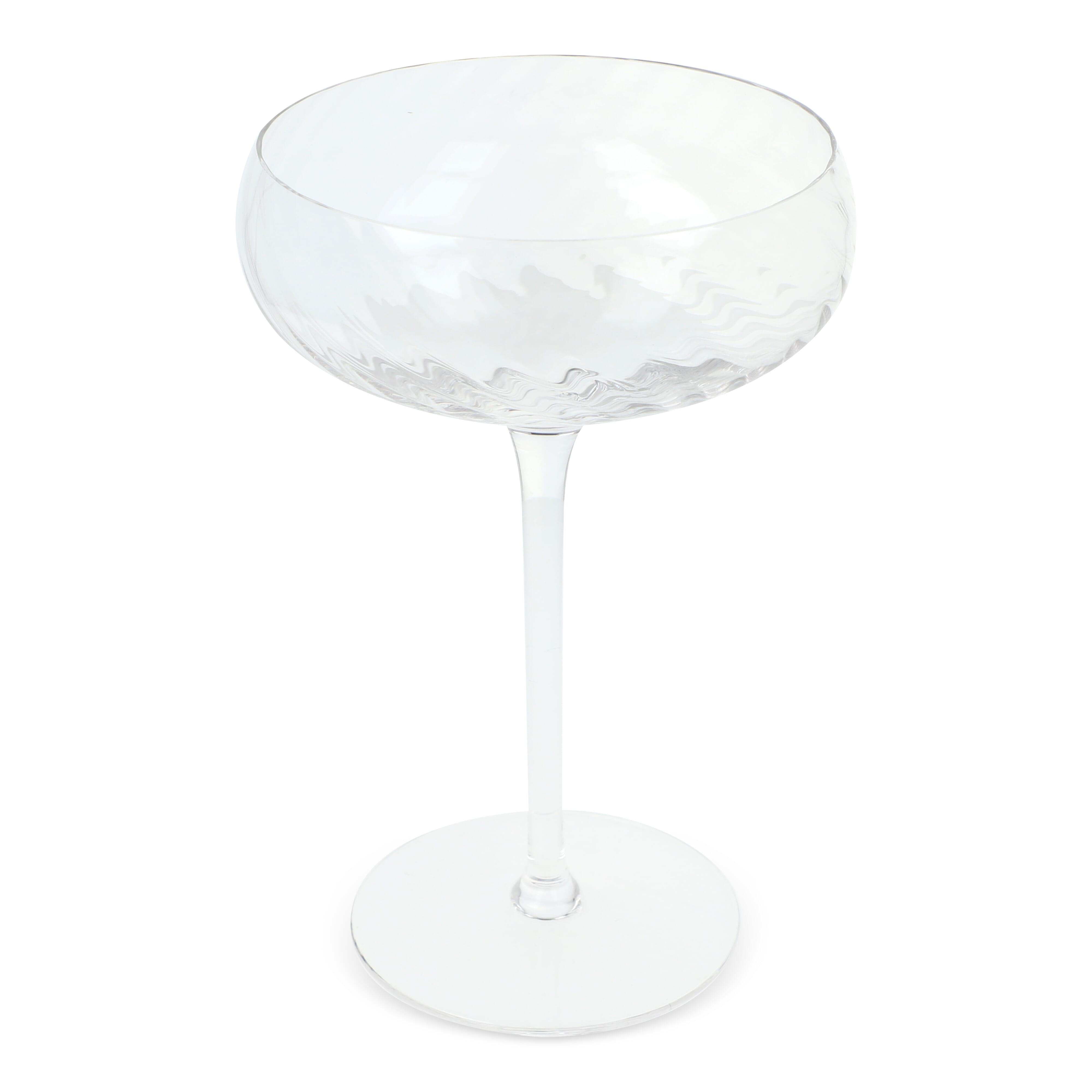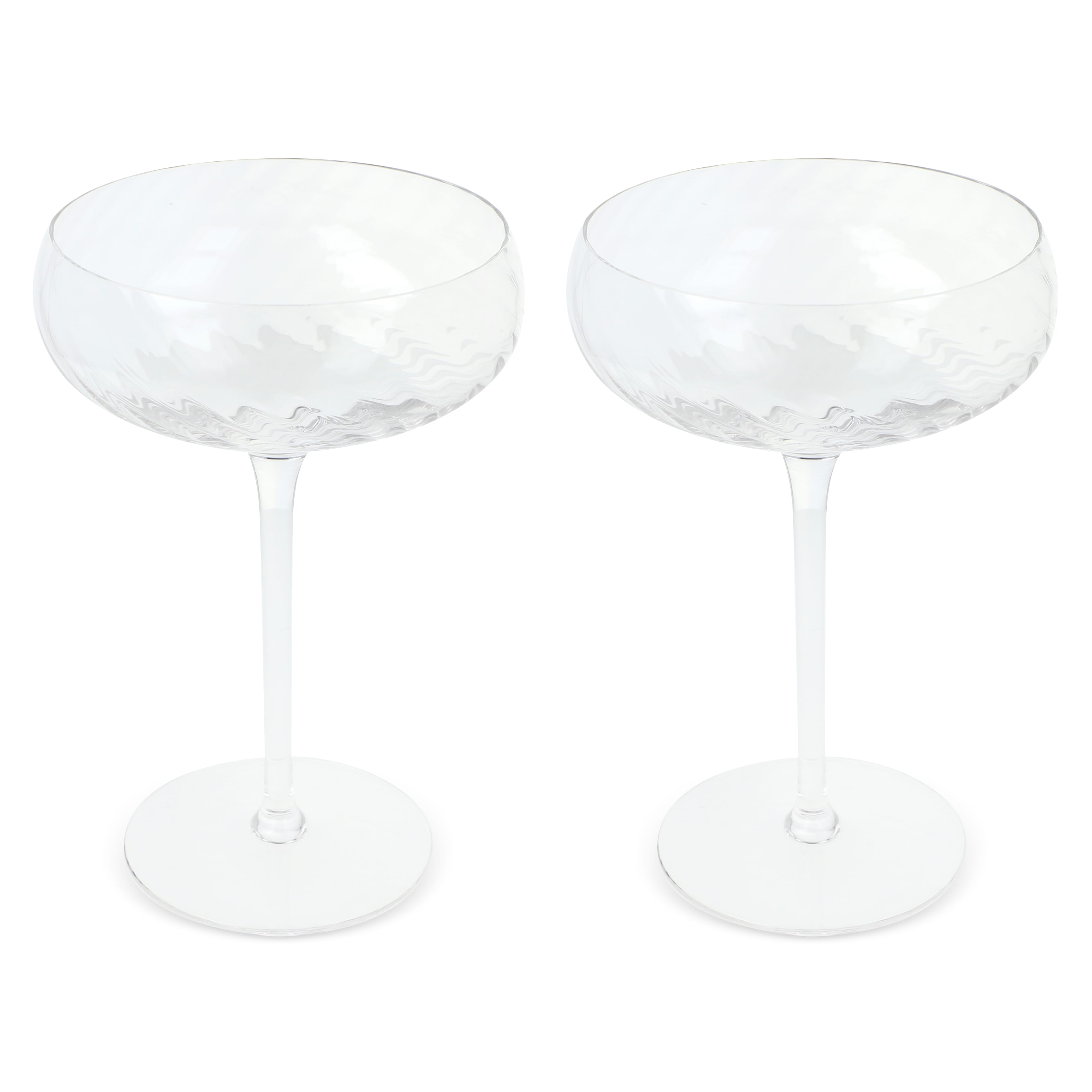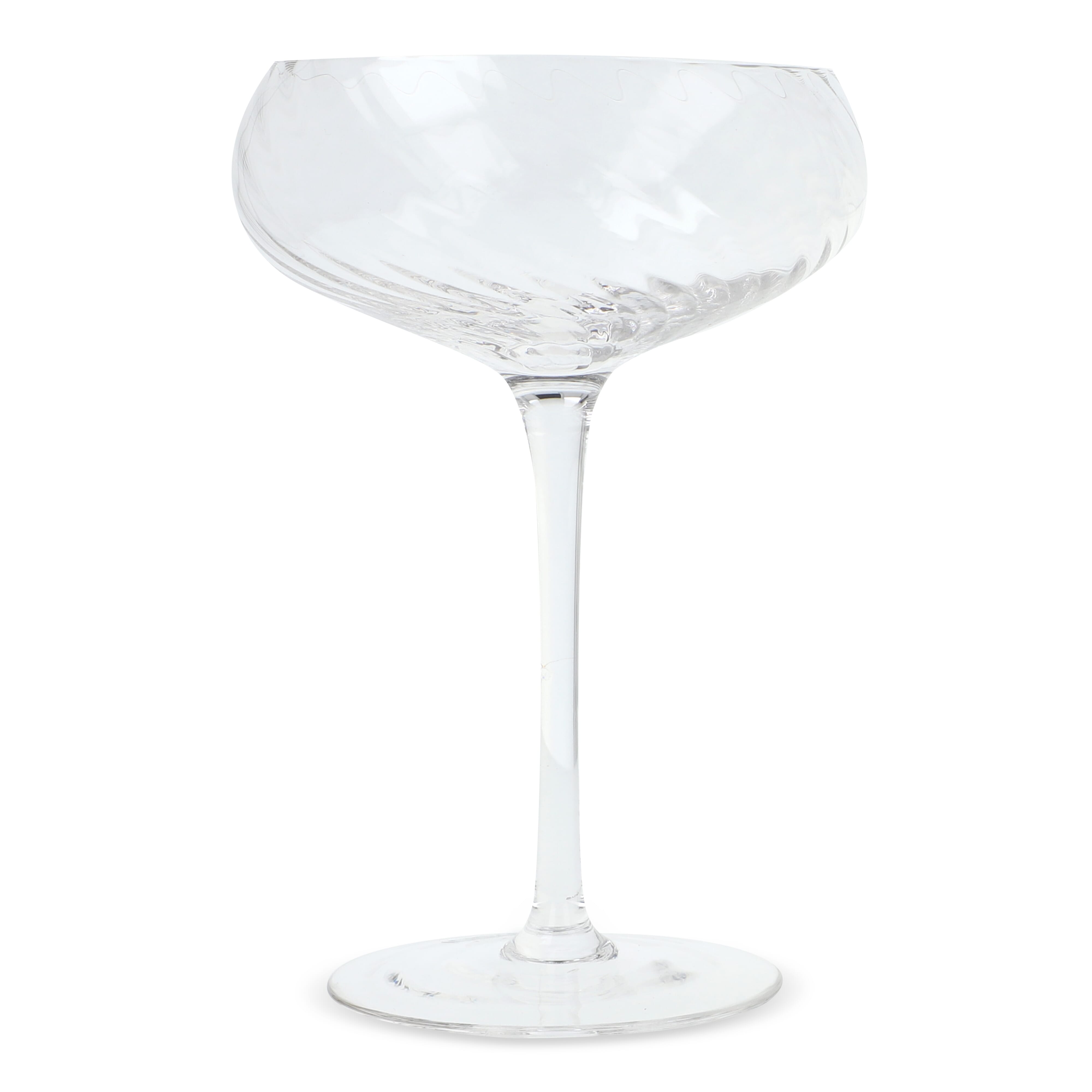 Diese luxuriösen Opacity Champagnercoupés sind aus klarem Glas mit einem schönen Schleuderglasmuster hergestellt. Die Coupes sind auch perfekt für Desserts oder Likör zu verwenden. Ein Design, das den Kontrast zwischen Luxus und Skurrilität widerspiegelt. Entwurf von Studio Byon. Wird als Set in einer Geschenkbox geliefert.