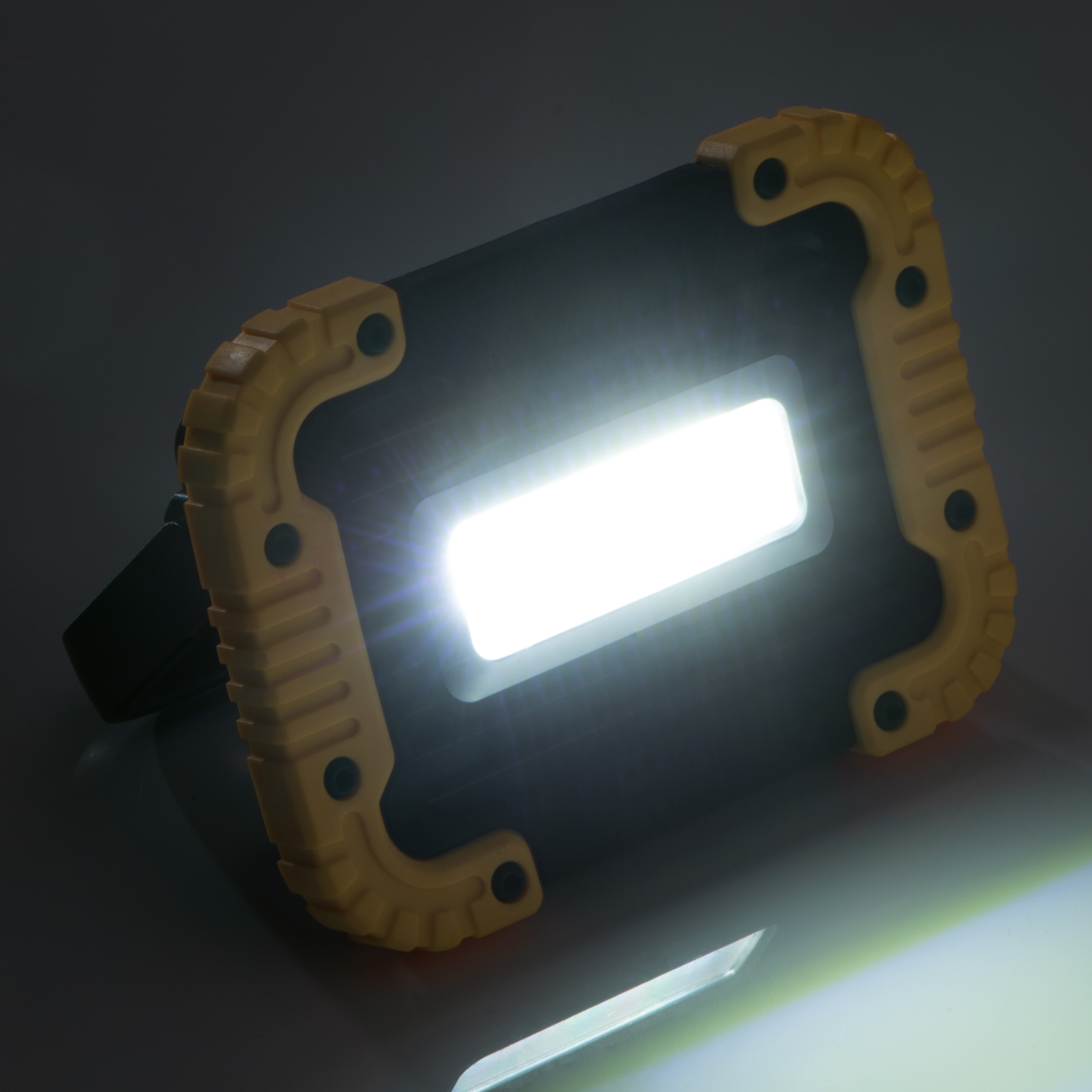 COB Bau- oder Arbeitslampe aus Kunststoff mit 10 Watt Leistung, 3 Lichtfunktionen (Stand-, SOS- und Blinklicht) und einem ausklappbarem Henkel zum Hinstellen oder Tragen. Ihre Werbung wird auf das Feld über der Leuchte gedruckt.