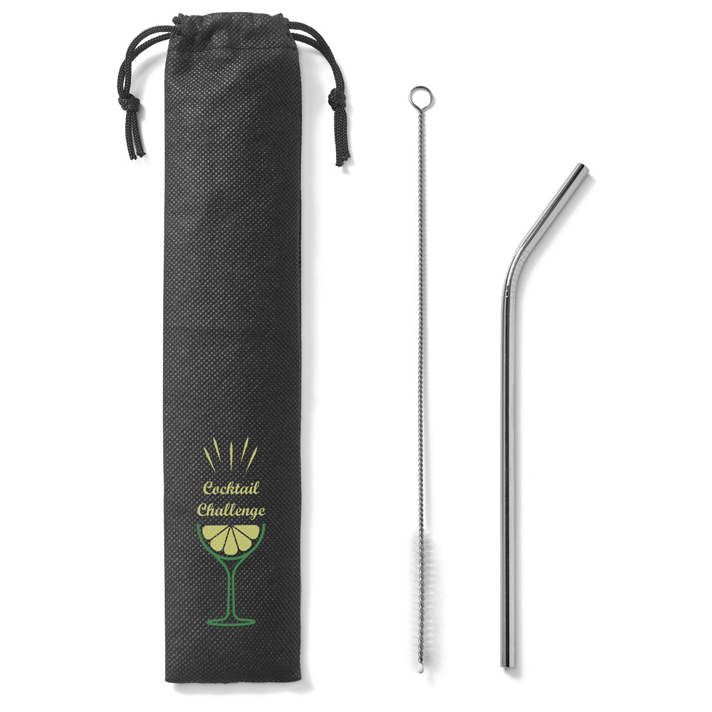 Strohhalm-Set aus Edelstahl bestehend aus wiederverwendbarem Strohhalm und Reinigungsbürste. Geliefert mit einer Tasche aus Non-Woven (80 g / m²). Strohhalm: ø6 x 215 mm | Tasche: 60 x 265 mm