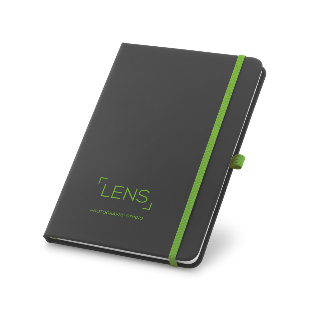 Notizbuch A5 mit Hardcover aus PU. Enthählt 160 linierte Seiten (70 g / m²), Trennband, Gummiband und Kugelschreiberhalter (Kugelschreiber nicht enthalten). 140 x 210 mm