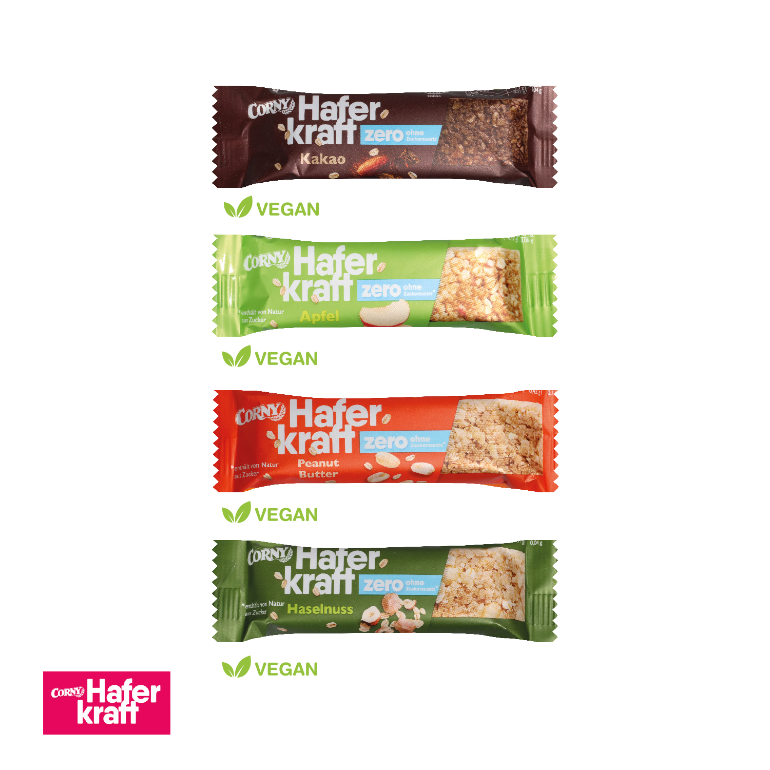 Hafersnack ohne Zuckerzusatz! CORNY Haferkraft zero ist der weiche Haferriegel ohne Zuckerzusatz und der perfekte Snack für unterwegs, im Büro oder auf Messen - ganz ohne Gewissensbisse.