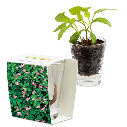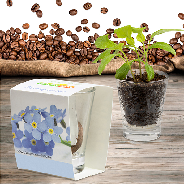 Echten Durchblick bis auf die Wurzel der Pflanze erlangen Sie durch das edle Caffeino-Glas, welches anschließend für den kleinen Kaffeegenuss weiterverwendet werden kann. Das hochwertige Glas wird mit einer Substrattablette als Erde und passend z. B. für Muttertag mit Samen der Vergissmeinnicht oder fröhlichen Sonnenblume geliefert. Bei diesem wertvollen Promotionartikel findet Ihre Werbebotschaft auf der umliegenden Banderole viel Platz. Restbestand: verfügbar bis 1.300 Stück - weitere Mengen auf Anfrage!