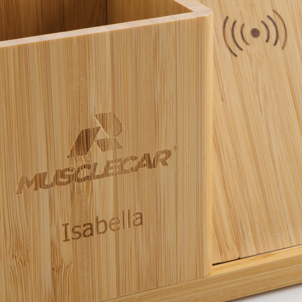 Kabelloses 10W-Schnellladegerät mit Stifthalter aus RCS (Recycled Claim Standard)-zertifiziert recyceltem ABS. Gesamter Recyclinganteil: 6% basierend auf dem Gesamtgewicht des Artikels (einschließlich Bambussockel) Die Bambusaußenseite des Organizers ist vollständig aus FSC 100-Bambus gefertigt. Inklusive 120cm Type-C Ladekabel aus RCS-zertifiziertem Recycling-TPE. Verpackt in FSC-Mix-Kraftkarton. Type-C Input: 5V/2A; 9 V/1,67 A. Wirless Output: 5V/1A;9V/1,1A (10W) Registered design®