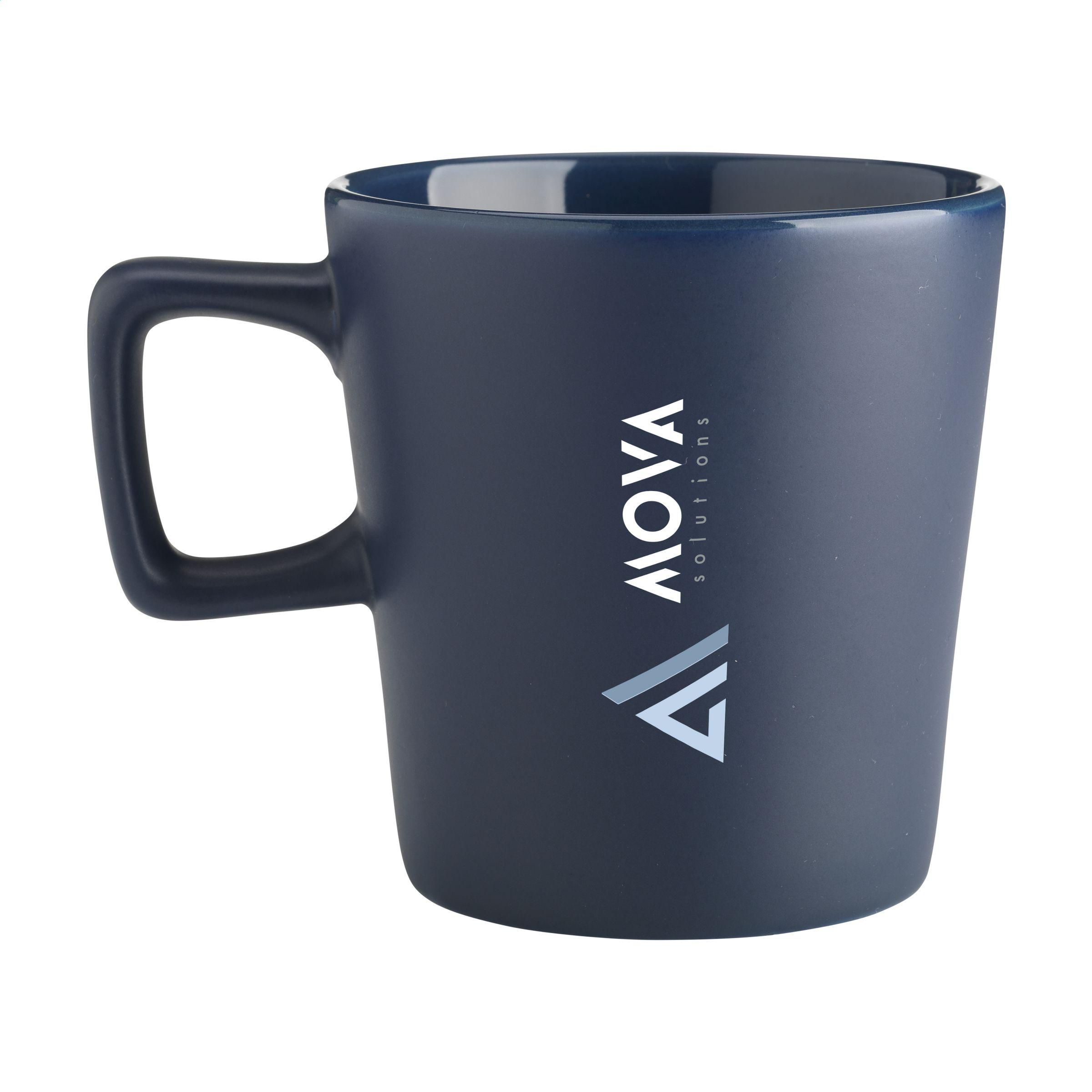 Moderner Becher aus hochwertiger Keramik und 5% recycelter Keramik. Der Griff hat eine kantige Form und fällt dadurch sofort auf. Die Außenseite des Bechers hat eine schicke matte Oberfläche, die Innenseite ist hochglänzend. Fassungsvermögen 290 ml. NOTIZ: Der weiße Becher kann nicht mit einer Lasergravur versehen werden, da diese nicht ausreichend sichtbar ist. Recycelte Keramikbecher werden hergestellt, indem Rohstoffe mit Bruchstücken von zerbrochenen oder unbrauchbaren Bechern, die in derselben Fabrik gesammelt wurden, vermischt werden. Die ausgemusterten Komponenten werden zu Pulver zermahlen und dann mit wichtigen Substanzen wie Kaolin und Quarz vermischt, bevor sie zu neuen Keramikprodukten verarbeitet werden. Um eine optimale Qualität zu gewährleisten, besteht das Endprodukt in der Regel zu 5 bis 10% aus recycelter Keramik. Die Verwendung von recycelter Keramik fördert die Kreislaufwirtschaft und reduziert den Bedarf an neuen Rohstoffen.