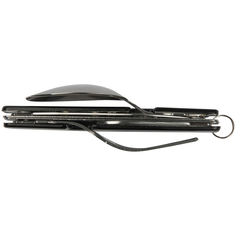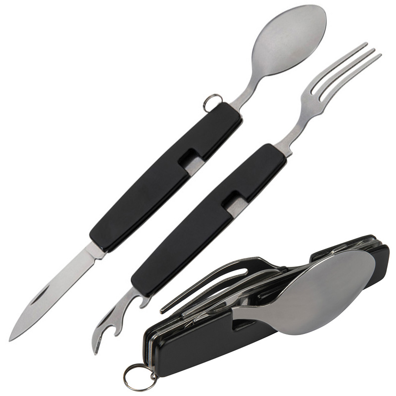 Zusammensteckbares Besteck, bestehend aus Löffel, Gabel, Messer, Flaschen- und Dosenöffner, ideal für Unterwegs. Ihre Werbung lasern wir auf das Mittelstück.